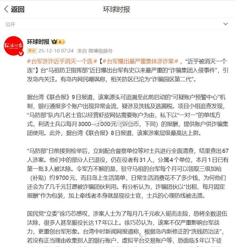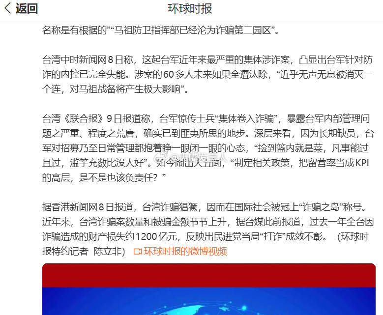 台军涉诈近乎消灭一个连 意不意外?岛内高明的诈骗者,说着一家亲、九二共识,来大陆骗,回到岛内自称深绿、自称不喜欢听共和国统一湾湾。此类代表,马、萧岛内低级的诈骗者,在岛内出租账号卡号,骗岛内人台军爆出最严重集体涉诈案,热点观点