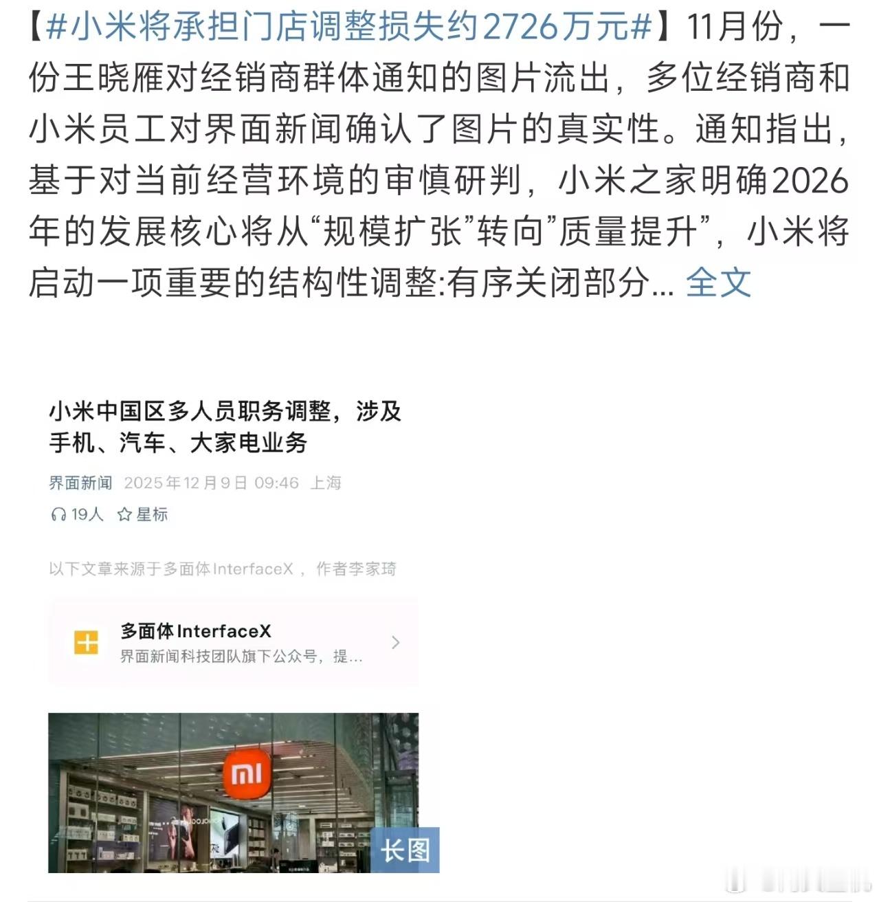 小米将承担门店调整损失约2726万元,拜托黑子看清楚,这是在协调帮助经销商调整门