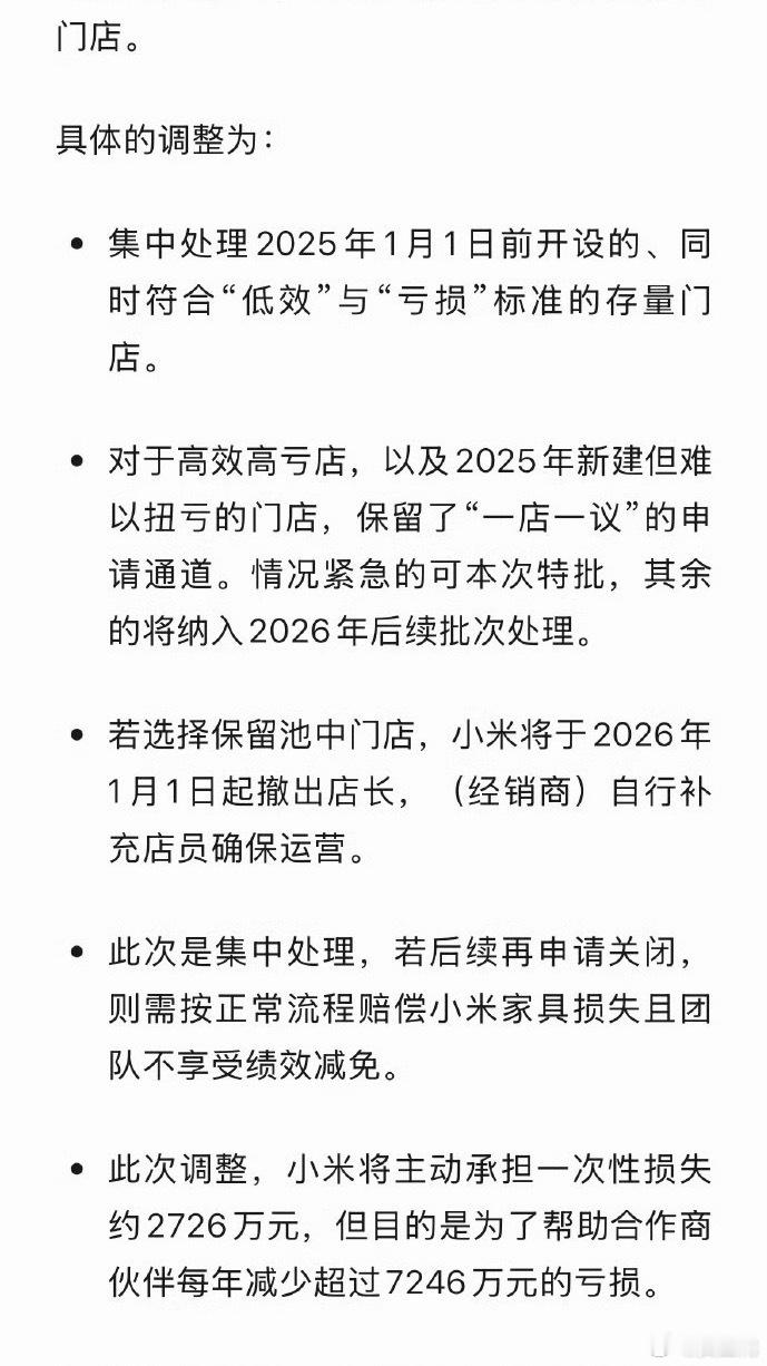 小米将承担门店调整损失约2726万元小米会解决掉一些低效亏损的门店,并主动承担损失约2726万元。从规模扩张转为质量提升,都是对的