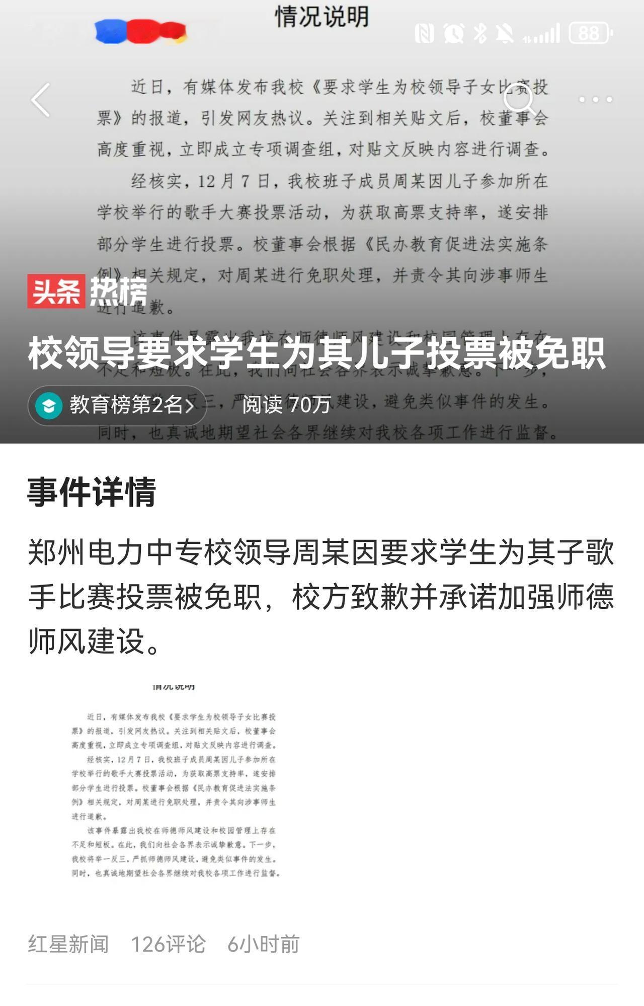 涉事校领导给学生布置投票任务,这不但涉嫌滥用职权,而且也是弄虚作假,还“教育”学生弄虚作假,因此,其被免职并不冤。而在核查存在给学生布置投票任务这一事实后,其儿子所在学校,也应该对网络投票进行调查,如果存在操弄投票的刷票行为,要取消获得的奖项。这也提醒学校,在组织有关校园比赛活动时,要谨慎采取网络投票的方式,不能助长拉票等弄虚作假违规投票行为,这不利于对学生进行诚信教育。
