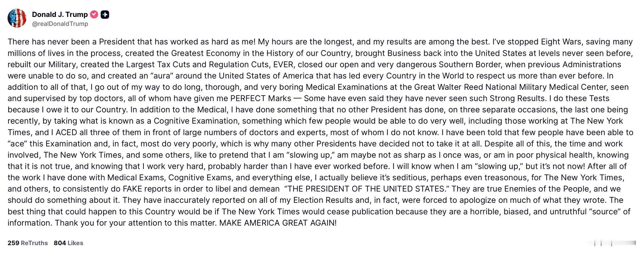 特朗普在自己的真理社交网站上发贴,非常愤怒的抨击有关他精力不济的报道,并用夸张的语言形容自己的业绩,称自己的体检报告和认知测试(用于识别老年痴呆)是完美的,还希望纽约时停刊。海外新鲜事 特朗普:从来没有哪位总统像我这样辛苦工作。我的工作时长是最长的,取得的成绩也是最亮眼的。我阻止了八场战争,挽救了数以百万计的生命;打造了美国史上最强劲的经济;让商业活动回到美国,达到前所未有的规模;重建军队;推出有史以来最大规模的减税与放松监管;关闭了原本开放而且极度危险的南部边境——此前的政府都做不到;还让美国重新树立起“威望”,使全球各国重新以更高的敬意看待我们。除此之外,我还坚持在沃尔特·里德国家军事医疗中心接受冗长、全面、而且非常无聊的体检,由顶级医生负责,他们给出的结果都是“完美”。有人甚至说,他们从未见过这么好的体检报告。我做这些检查,是因为我对国家有责任。此外,我还做了历任总统从未做过的另一件事——我三次参加所谓“认知测试”,最新的一次就在不久前。这种考试难度不低,很多人根本考不好,包括《纽约时报》那些人。但我在三次考试中都拿到满分,而且是在众多医生和专家面前完成的,其中许多人我根本不认识。我被告知,很少有人能拿满分,因此许多其他总统干脆不考了。尽管如此,《纽约时报》和某些人还是喜欢宣称我“变慢了”、不如过去敏锐、甚至身体不好。但他们清楚那不是真的,也知道我现在比以往任何时候都更努力。我会在意识到自己真的“变慢”时告诉大家,但现在绝对不是。在经历了这些体检、认知测试和其它工作之后,我认为《纽约时报》等媒体持续编造假新闻,诋毁并污蔑“美国总统”,这种行为已经接近煽动叛乱,甚至可能触及叛国。他们才是真正的人民公敌,我们必须对此采取行动。他们对选举报道错误百出,甚至被迫为自己的报道道歉。如果说有什么事是能真正造福美国的,那就是《纽约时报》停刊——因为他们是一个极其糟糕、带有偏见、且不诚实的“消息来源”。为海外华人提供有价值的信息与分析,更多内容和全文可在蓝天、电报、x查找causmoney,或直接谷歌搜索caus.com