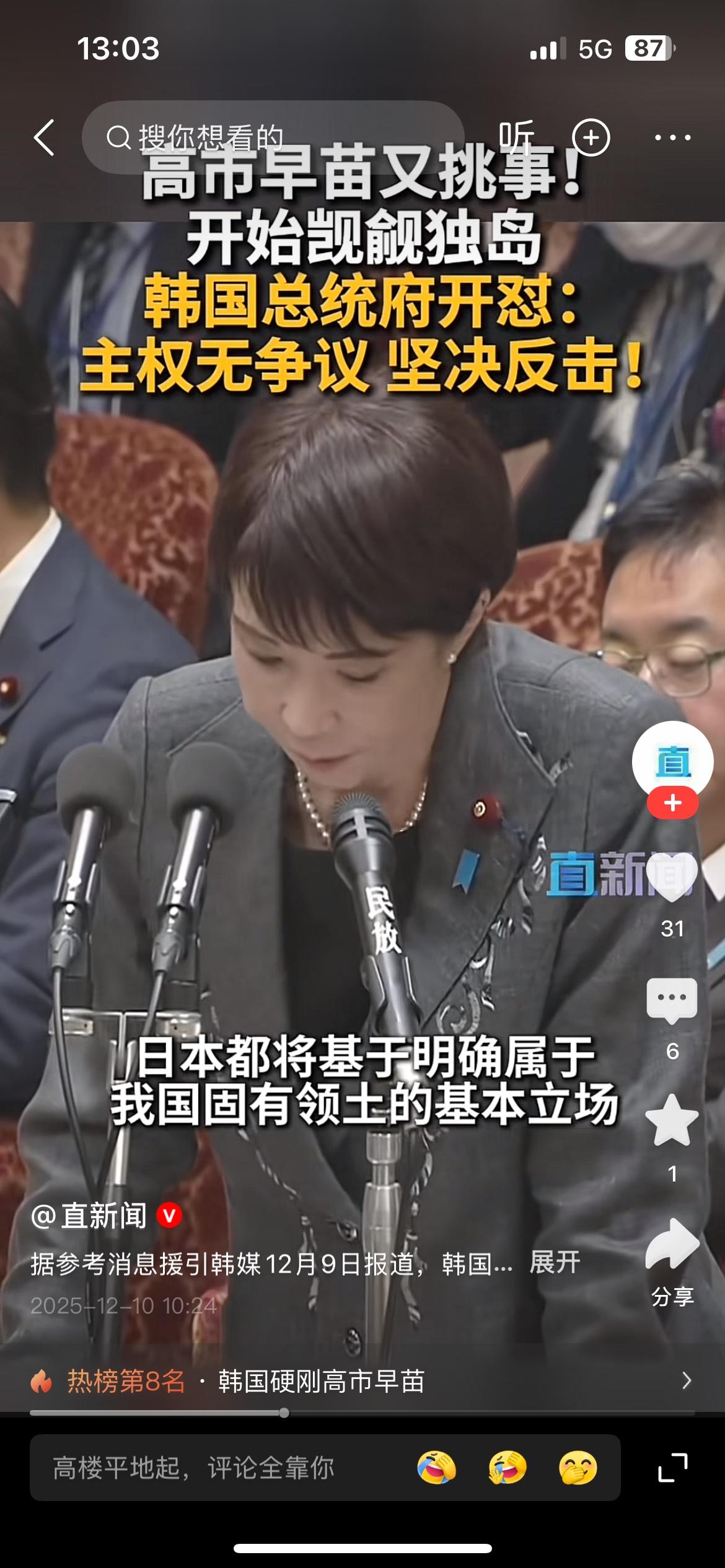 还要继续挑事吗? 近日,日本首相高市早苗在议会答辩时强硬宣称:“竹岛是日本领土,日本始终会基于该岛明确属于我国固有领土这一基本立场,不会改变!” 对此韩国愤怒回应,韩方将予以坚决且严厉的回击! 这是日方继抛出“台湾有事、日本有事”论调后,又一次发表涉及他国领土的错误言论!正如中国所指出的,日本极右翼势力妄图复活军国主义,颠覆二战秩序! 高市早苗就算想塑造强硬形象,也不该同时四处树敌吧,东北亚这些国家可都与日本有着血海深仇!更令人费解的是,美国似乎完全置身事外,难不成这全是美国设的局? 高市早苗内阁 日本政府对高市错误言论的态度如何