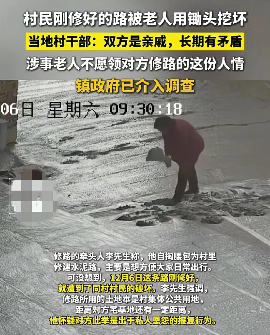 80岁老人3个小时用锄头挖坏村民刚修好的路,只为个人恩怨。 据村干部透露:老人与
