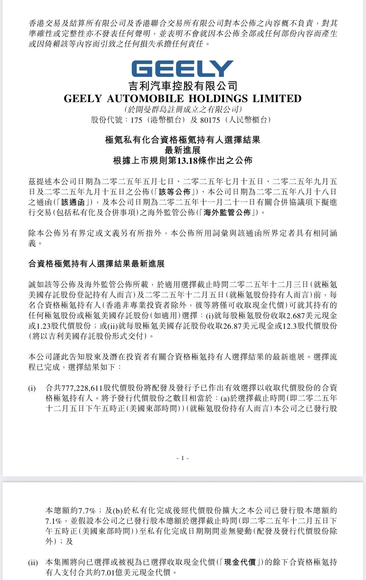“回归一个吉利”刚极氪私有化最新进展此前合资格极氪持有人(香港非专业投资者除外)可就所持股份或美国存托股份,选择收取现金或代价股份,选择截止时间因持有人类型分设为12月3日与12月5日。此次选择流程已完成,777,228,611股代价股份,该股份数占吉利当前已发行股本约7.7%,占私有化完成后经扩大股本约7.1%;同时,集团还将向选择现金对价的剩余持有人支付约7.01亿美元现金。为筹措现金代价的境外美元,吉利拟签订最高4.2亿美元短期融资协议,由中银香港任协调人及代理,融资有364天的偿还期限,且设置了控股股东相关的强制提前还款触发条件。此外,吉利已申请代价股份上市及买卖,后续将适时披露交易进展。