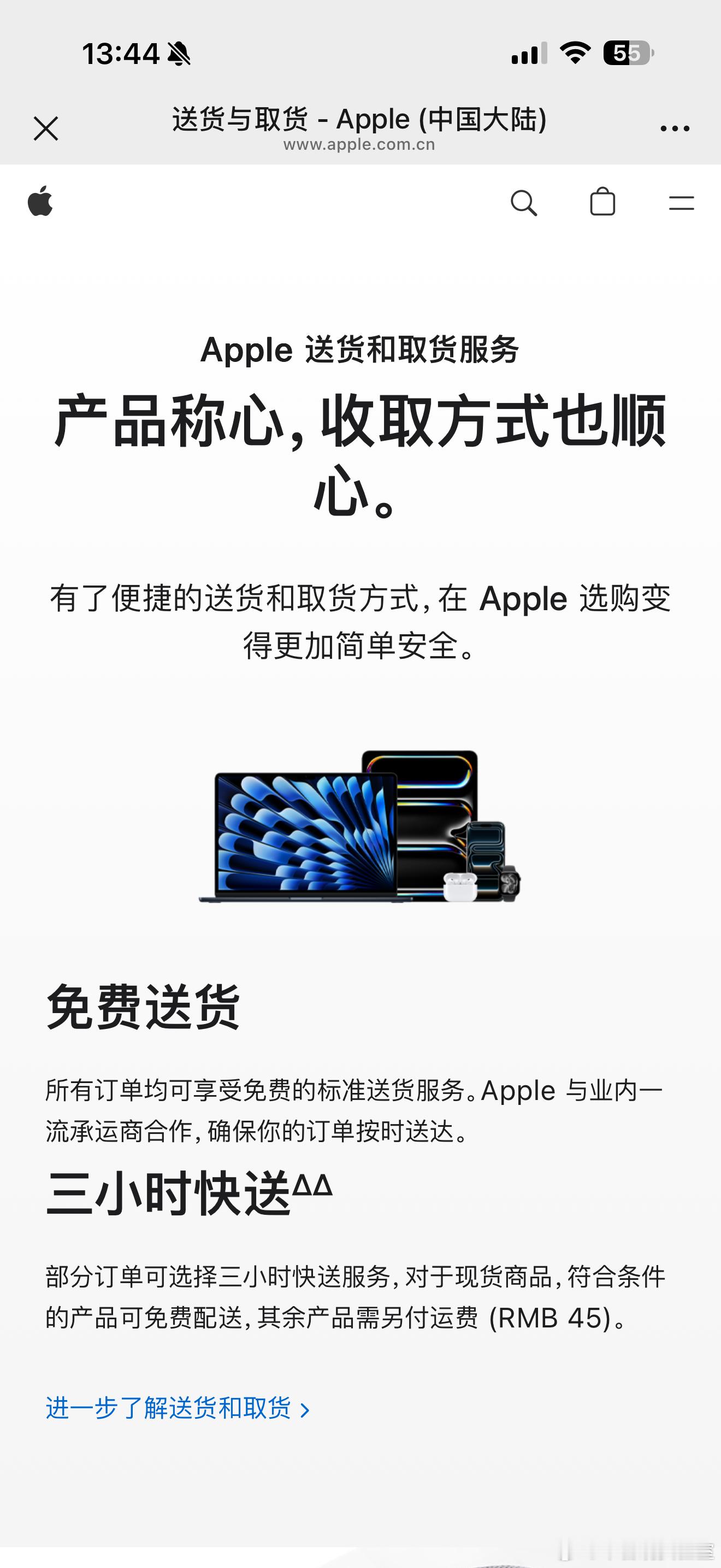 Apple 已于 12 月 10 日开始在中国大陆地区正式推出免费的三小时快送服务(针对部分产品)。对于现货商品,当顾客在 Apple Store 在线商店或 Apple Store app 为部分订单(仅限某些地址)选择三小时快送服务这个更快的送货方式时,iPhone、iPad、Apple Watch、Macbook Pro、Macbook Air 或 AirPods 的产品可享免费配送,其余产品需另付 45 元运费。具体以结账页面信息为准。