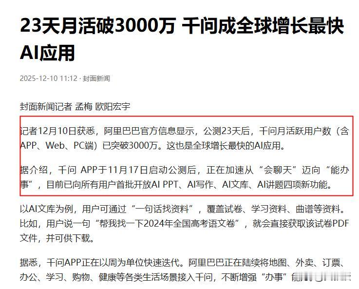 手机弹出一条新闻,让人真是没想到,一切都太快了! 今天看到新闻说,阿里千问公测23天后,用户数已经突破了三千万,这个消息带来的震撼可一点不比之前公测一周破千万低啊。 阿里千问这个“后劲”比我想象中还要大,也打脸了一些人“昙花一现”的看法。 其实我倒是觉得,阿里千问能够在一个月时间不到,就将月活用户做到三千多万,这并不奇怪,至于原因有二: 第一,阿里千问将AI从能聊天带入到了“能办事”的阶段。过去,大多数人对于AI应用的看法,都是停留在能聊天上面,一般就是有啥问题不懂,去问一下,通过对话得到问题的答案。 而现在阿里千问不同,它不只是简单的“对话聊天”,更是能够真正的解决我们的工作,能办实事。 千问公测后已经上线了四大新功能,分别是AI PPT、AI文档、AI文库以及AI讲题,直接解决了我们很多的办公、学习问题。 比如说你工作中想要做一个PPT,现在只需要打开千问,和他需求,就会直接生成一个PPT,而不是只给一段文字,这效率无疑是非常高的。自然受用户认可。 第二,实现了“软件OTT化”。很多朋友在办公的时候肯定都经历过,做一个工作需要频繁打开好几个应用软件,生成文档需要打开Word,想要做个PPT需要打开PPT软件,比较的麻烦。 而现在有了阿里千问就不一样了,它一个入口就解决了所有问题,想要生成文档,只需要在对话框里说一句话、想要做一个PPT、想要修改格式等等,也只需要在对话框说出需求就行。 简单说,现在只要有了千问,就相当于有了所有办公软件,一天工作在一个应用就能完成,不用频繁打开多个应用了,这样的体验,用户焉能不爱? 而且对于用户而言,早就已经厌倦了AI只能聊天的体验,能办事的AI才是当下他们最想要的。 不得不说,千问一个月不到破3000万,既是其能力的体现,也是当下年轻人对于AI需求转变的一个具象化表现。很明显,AI迈入能办事时代的第一枪已经打响了!