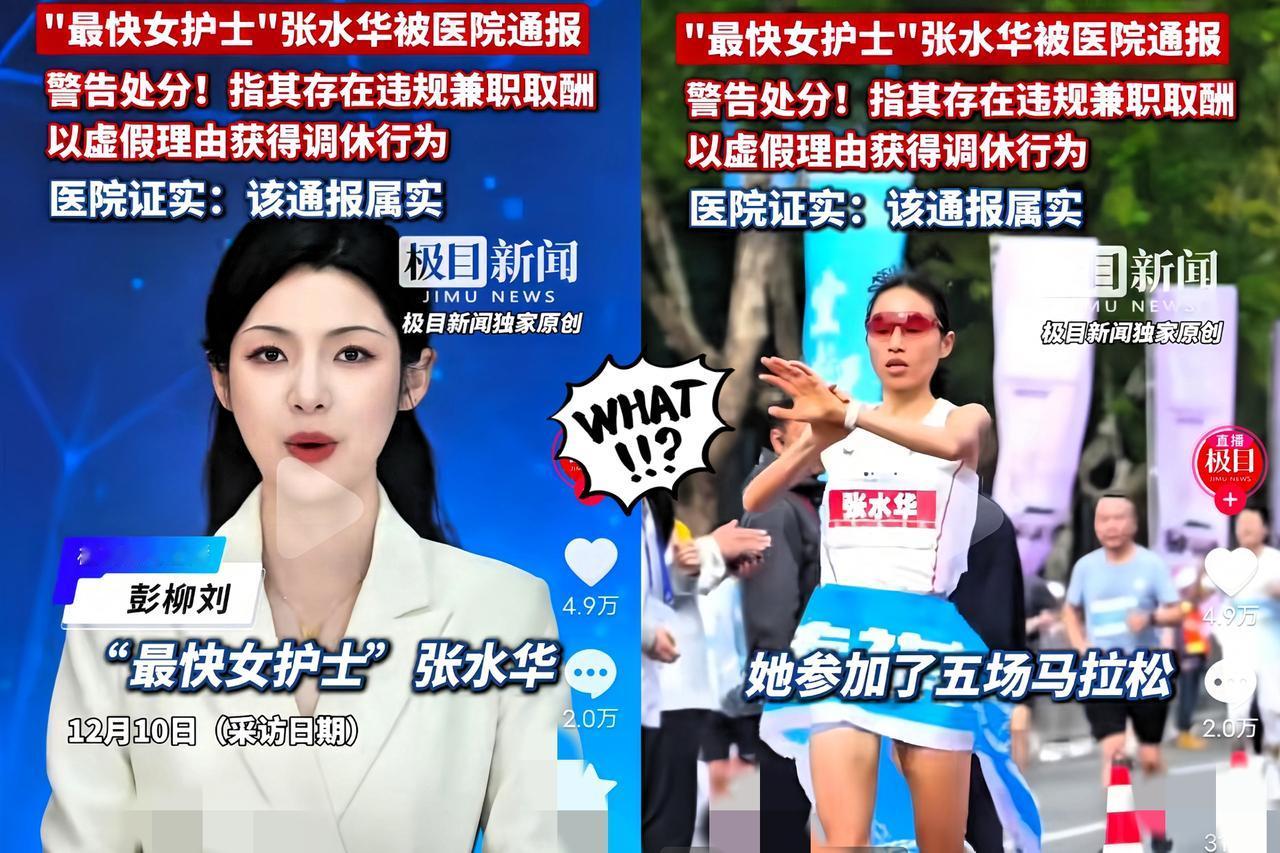 事实证明,鱼和熊掌不可兼得, 有知情人士透露, 最快女护士张水华已经被医院处分啦。 她代言了361°品牌,还以不实调休理由跑去参加宜昌马拉松比赛! 医院觉得这是违规获取报酬,给了她6个月警告处分,还取消了她2025年的评优资格! 跑步对张水华是爱好,可在医院看来,接代言跑马拉松就像“兼职”! 护士调休本是为了休息或处理要事,这种行为难免让人觉得不妥! 但换个角度想,要是真热爱跑步,在平衡不了爱好与本职工作时,是不是全职去跑马拉松,也是一种选择呢? 你们觉得呢?