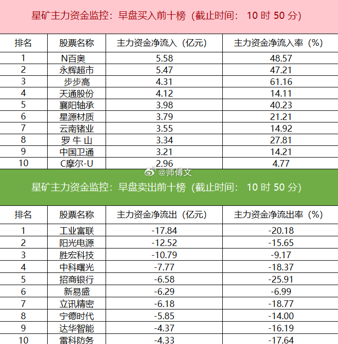 【主力资金监控:工业富联净卖出超17亿】星矿数据显示,今日早盘主力资金净流入商贸零售、能源金属、农林牧渔等板块,净流出电子、电新行业、计算机等板块,其中电子板块净流出超114亿元。个股方面,N百奥大涨,主力资金净买入超5.58亿元位居首位,永辉超市、步步高、天通股份获主力资金净流入居前;工业富联遭净卖出超17亿元,阳光电源、胜宏科技、中科曙光资金净流出额居前。财经理财 今日看盘