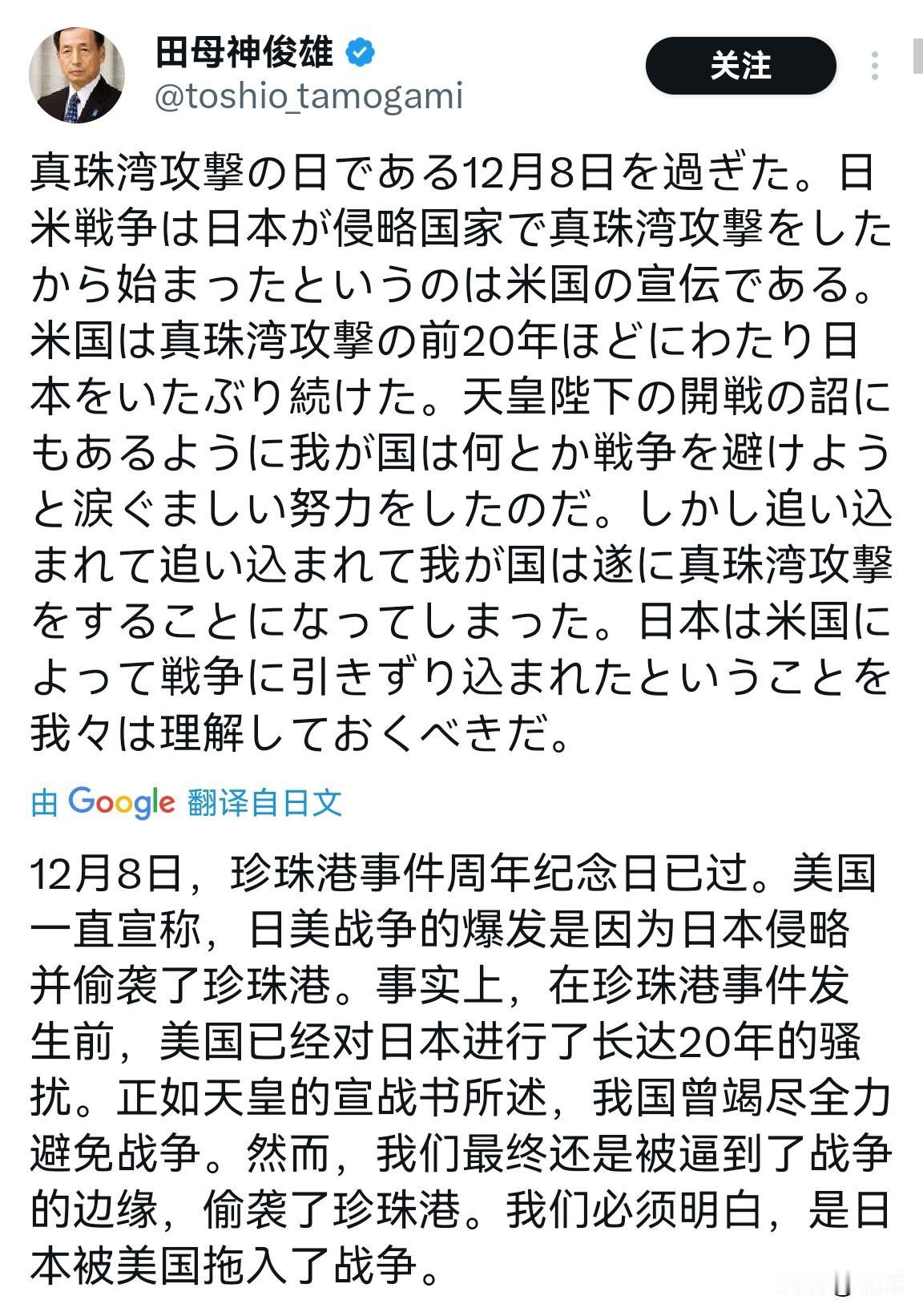 这个日本人说日本“偷袭珍珠港”是被美国“逼上梁山”的被动选择。 日本前航空幕僚长田母神俊雄声称,偷袭珍珠港,发动太平洋战争,是因为美国之前“折磨”了日本近20年,日本被逼无奈,并且日本曾竭尽全力避免战争。 是真没想到,日本人不光对中国用这种“受害者”的逻辑,对美国也一样。这种逻辑完全是日本对外侵略扩张的遮羞布,把加害者粉饰成受害者。这种扭曲的历史观,既是对自身罪责的逃避,也是对国际公理的践踏!