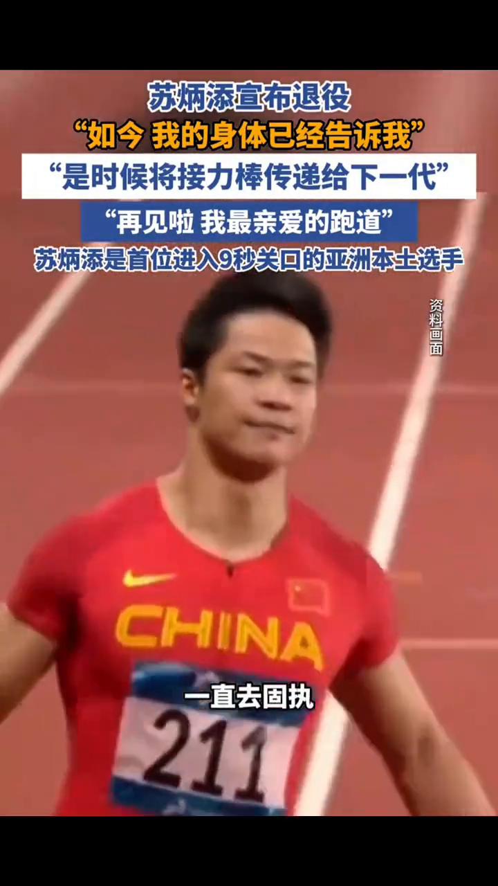 苏炳添宣布退役,如今我的身体已经告诉我,是时候将接力棒传递给下一代。再见啦,我最亲爱的跑道。 苏炳添是首位进入9秒关口的亚洲本土选手。 有很多人都说:我想不到你们可以练到这么大的年纪。其实如果心里面一直放不下,一直去固执,要去坚持做一件事情,你就会成功。