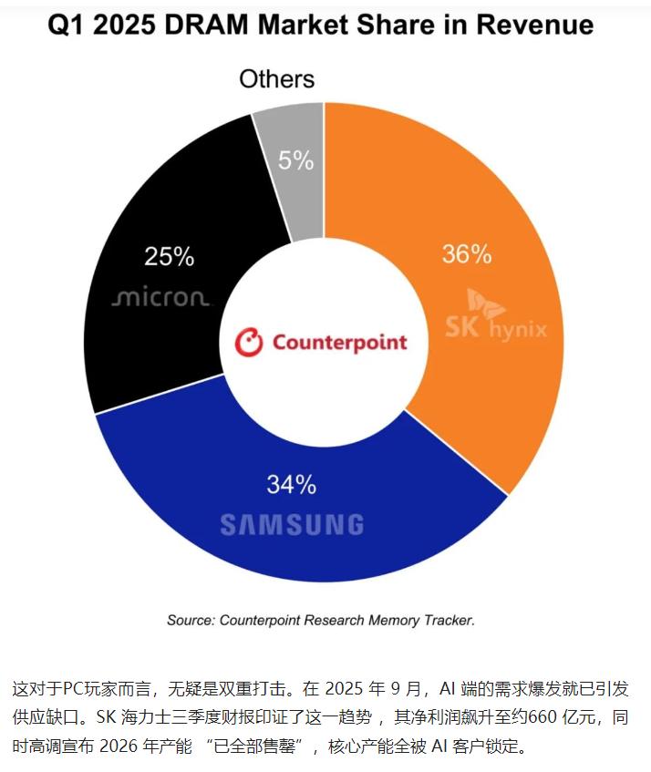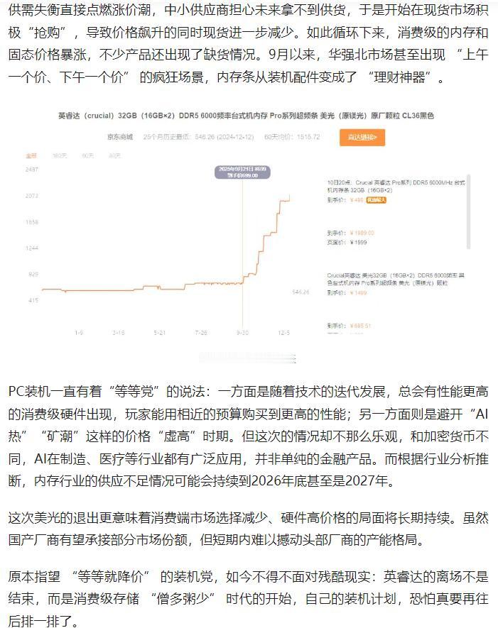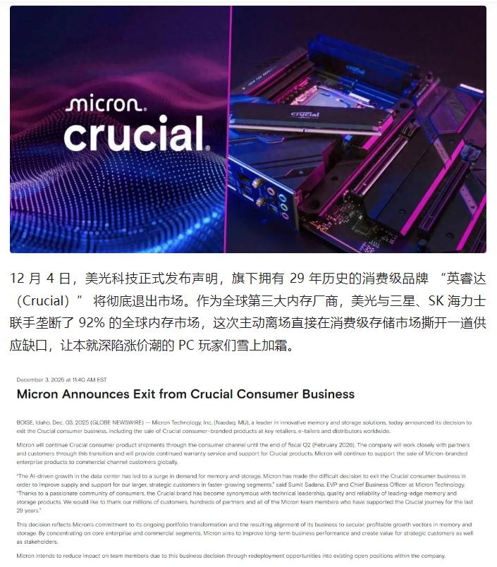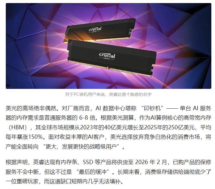 美光旗下消费级存储品牌英睿达宣布退市,将产能全面转向高收益的 AI 存储领域。这一调整进一步加剧消费级存储市场供需失衡,推动价格暴涨,且供应短缺或持续至 2027 年,让 PC 装机玩家的等待变得更加漫长。 原文来自:游研社《内存三巨头之一撤场,PC装机玩家雪上加霜?》