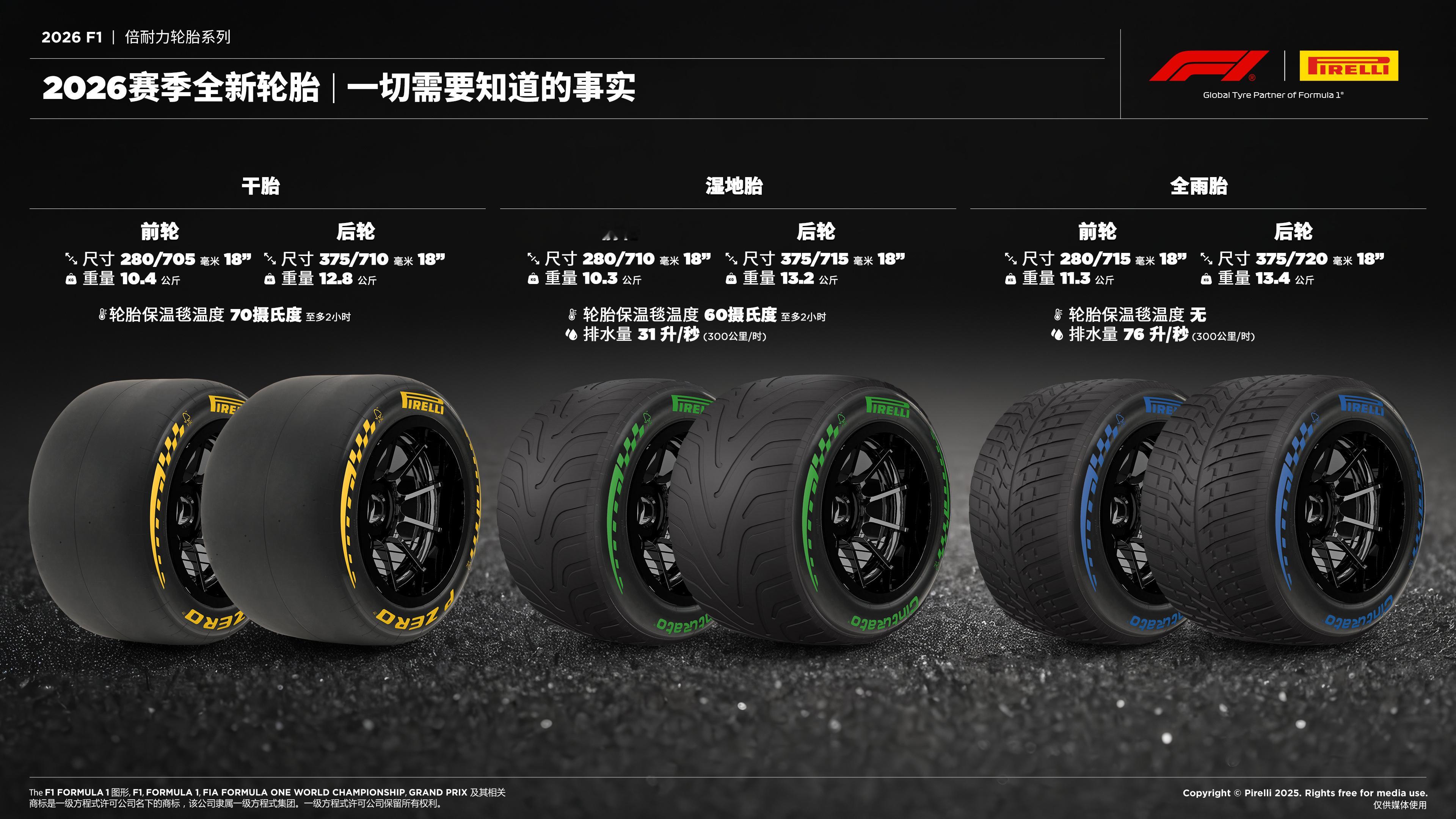 f1 为2026赛季F1准备的全新倍耐力轮胎系列在阿布扎比亚斯码头发布,意大利轮胎制造商在这条赛道主办了一场所有车队参与的集体测试。2026赛季的F1轮胎系列将由五款配方组成,从最硬配方的C1轮胎到最软配方的C5轮胎。性能表现接近于本赛季轮胎,但轮胎两两之间有着更宽泛、更稳定的性能表现差异,以鼓励多元的不同比赛策略。全新轮胎尺寸更小,以适应最新规则打造的新款赛车。轮辋直径仍是18英寸,但前轮胎面宽度缩小了25毫米,后轮胎面宽度缩小了30毫米。因此,前轮的总直径缩小了15毫米,后轮的总直径则缩小了10毫米。2026赛季轮胎在12月9日的测试中进行赛道实测,装配在每支车队的修改版赛车(“骡车”)上,由一位或多位正赛车手驾驶该款赛车测试。根据技术规则,该轮胎配方系列将于12月15日正式完成认证。全新轮胎首次搭载新款赛车亮相的环节将在明年1月26-30日的巴塞罗那赛道测试,而这些最新款轮胎也将在未来几周陆续公布的车队新赛季发布会上现身。