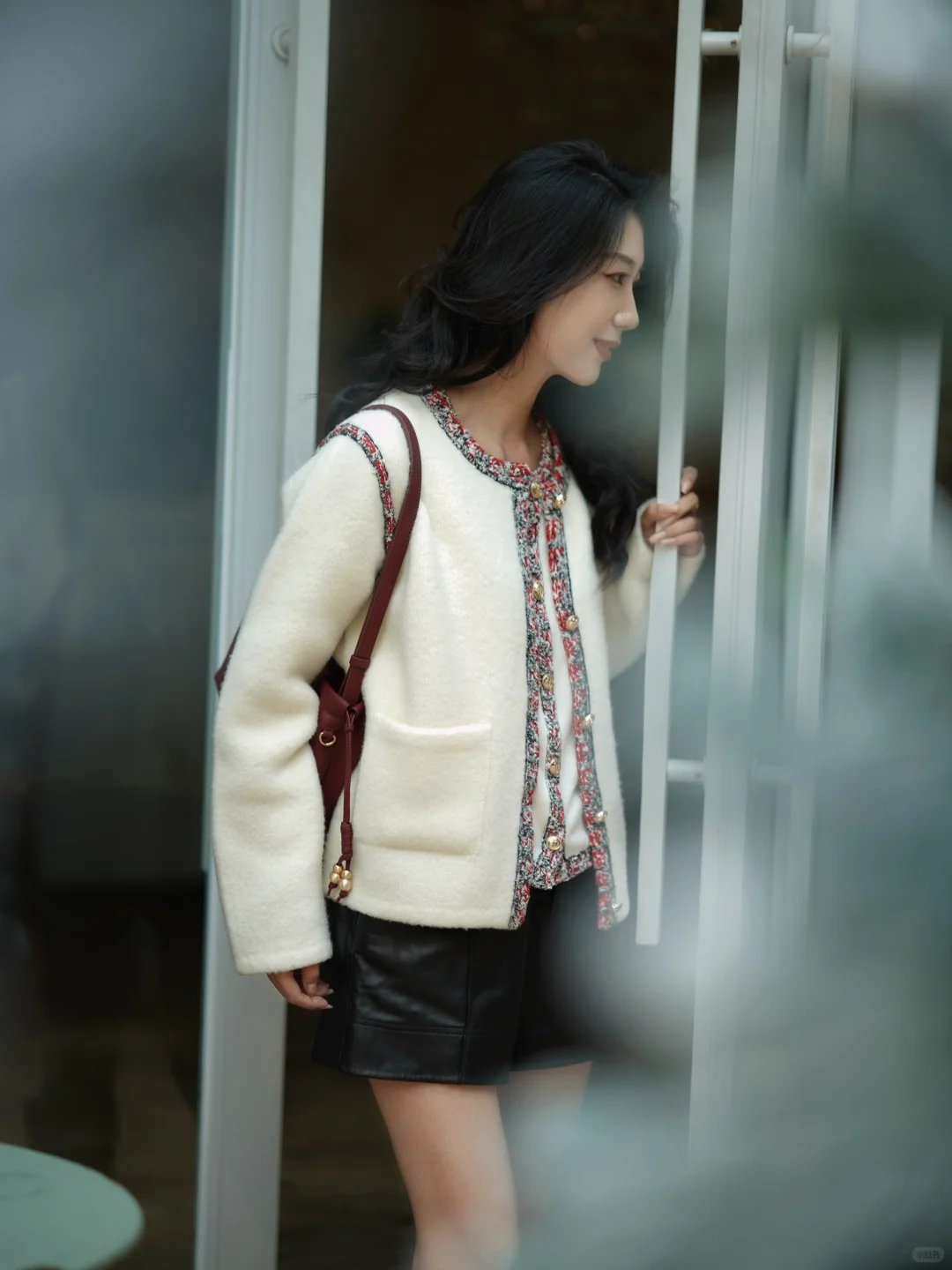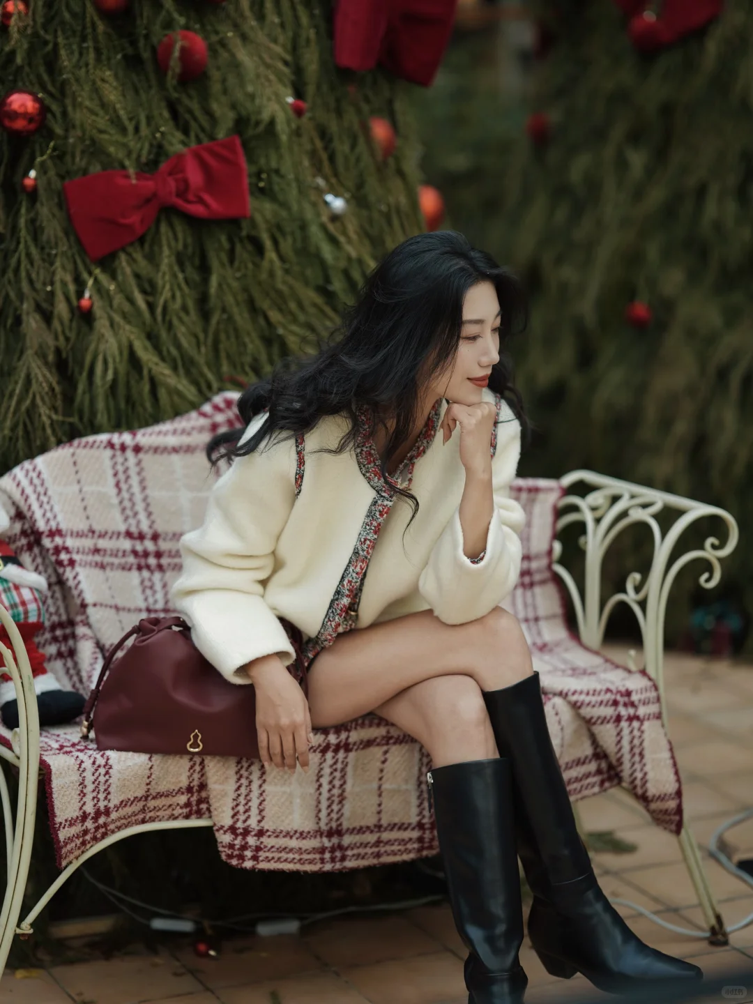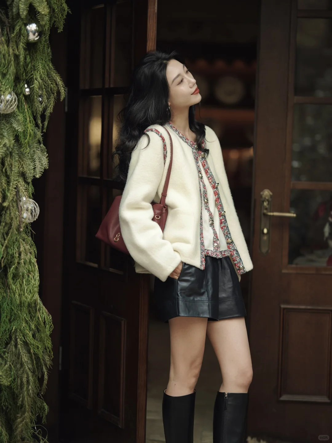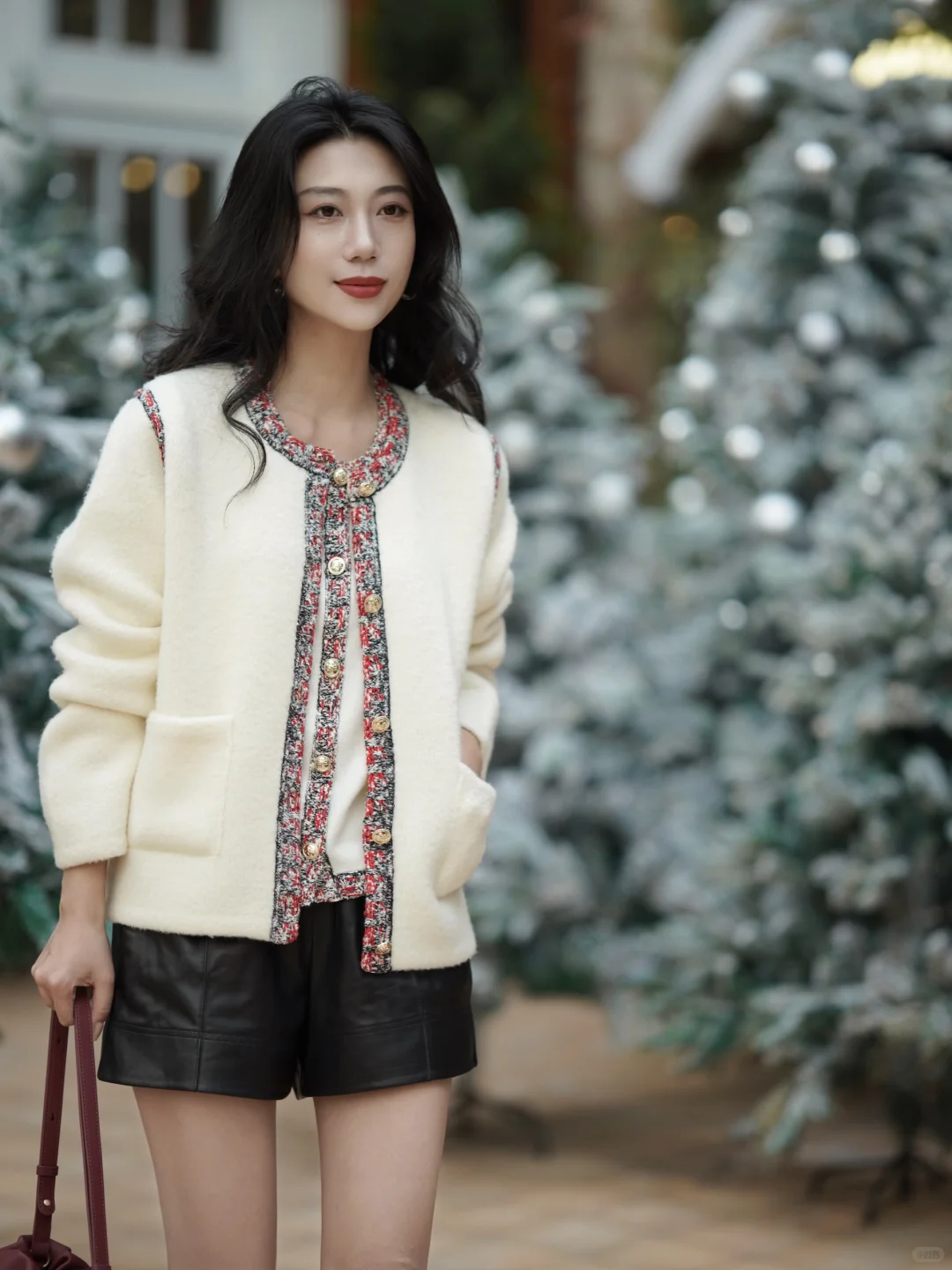 我们笑着举起杯,烛光在杯里轻轻晃。穿了一套白色为主的上衣,拼接秋冬系列的彩点花呢,红色粗花的装饰边呼应着圣诞氛围,搭了条黑色绵羊🐑皮裤,这样的节日,我想用轻快又不失时髦的穿搭来迎合自己的内心感受,这一刻感觉自己正年轻,年轻的快乐是什么?大概就是这样吧:在满世界精心布置的浪漫里,我们盛装出席,成为这浪漫的一部分。