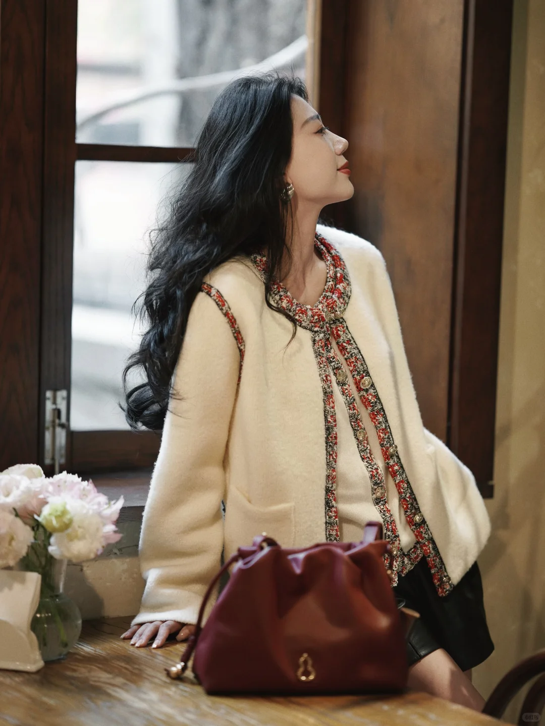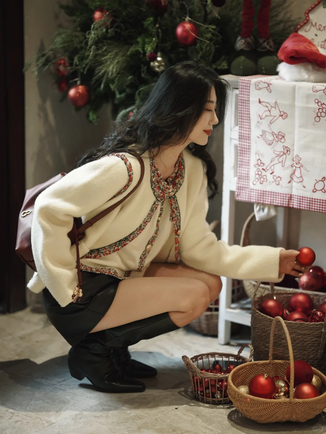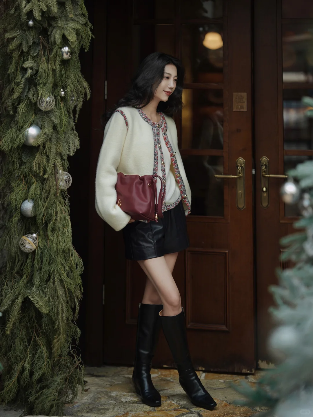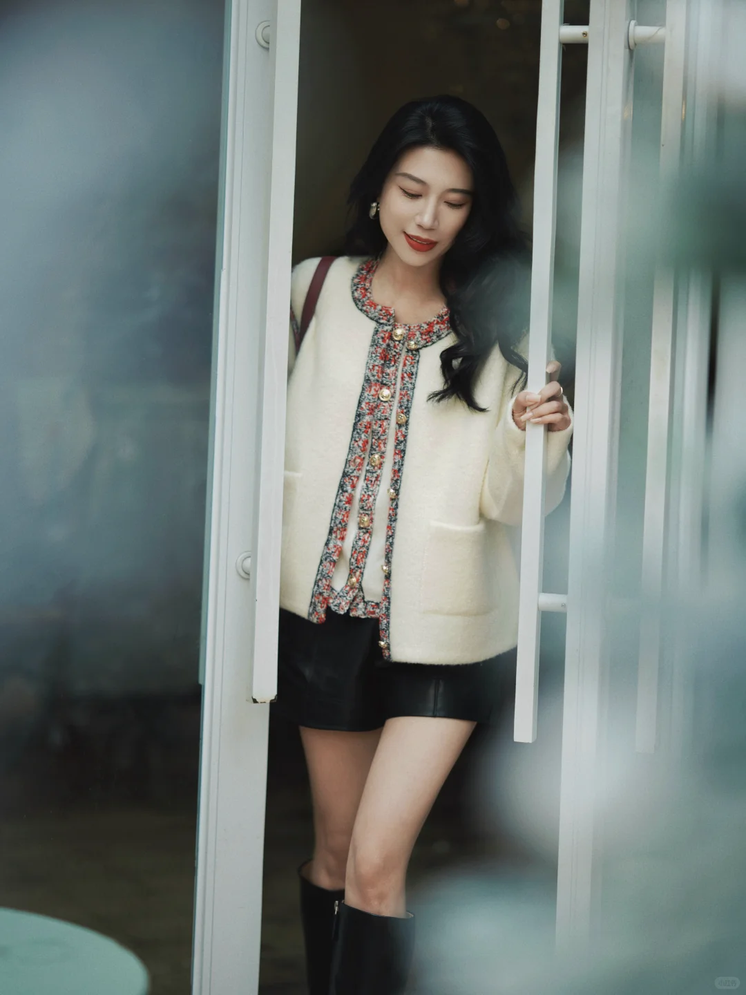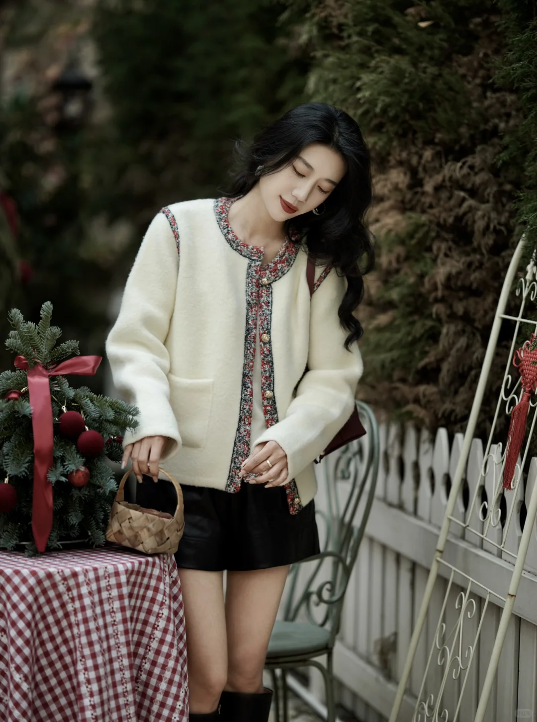 我们笑着举起杯,烛光在杯里轻轻晃。穿了一套白色为主的上衣,拼接秋冬系列的彩点花呢,红色粗花的装饰边呼应着圣诞氛围,搭了条黑色绵羊🐑皮裤,这样的节日,我想用轻快又不失时髦的穿搭来迎合自己的内心感受,这一刻感觉自己正年轻,年轻的快乐是什么?大概就是这样吧:在满世界精心布置的浪漫里,我们盛装出席,成为这浪漫的一部分。