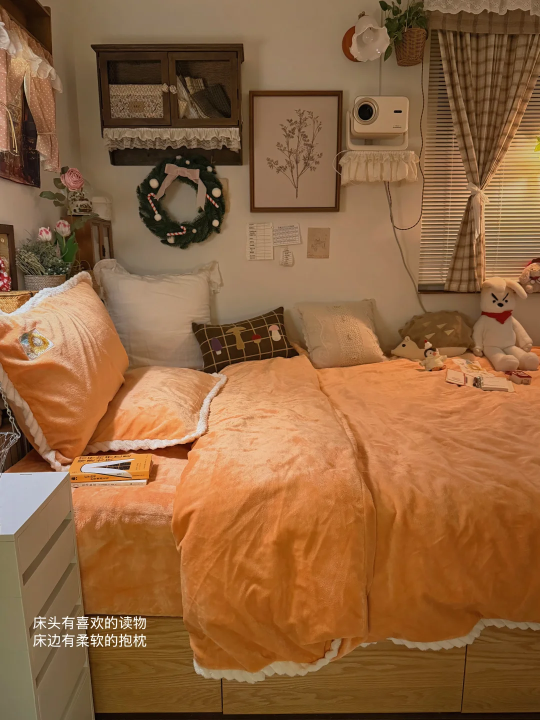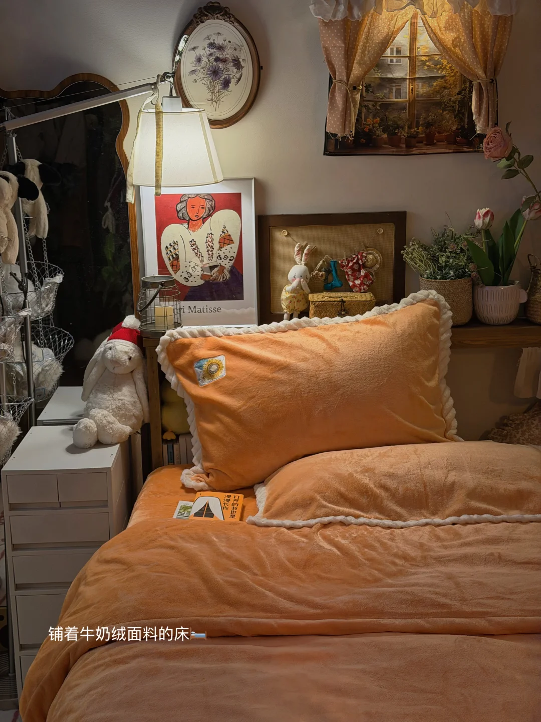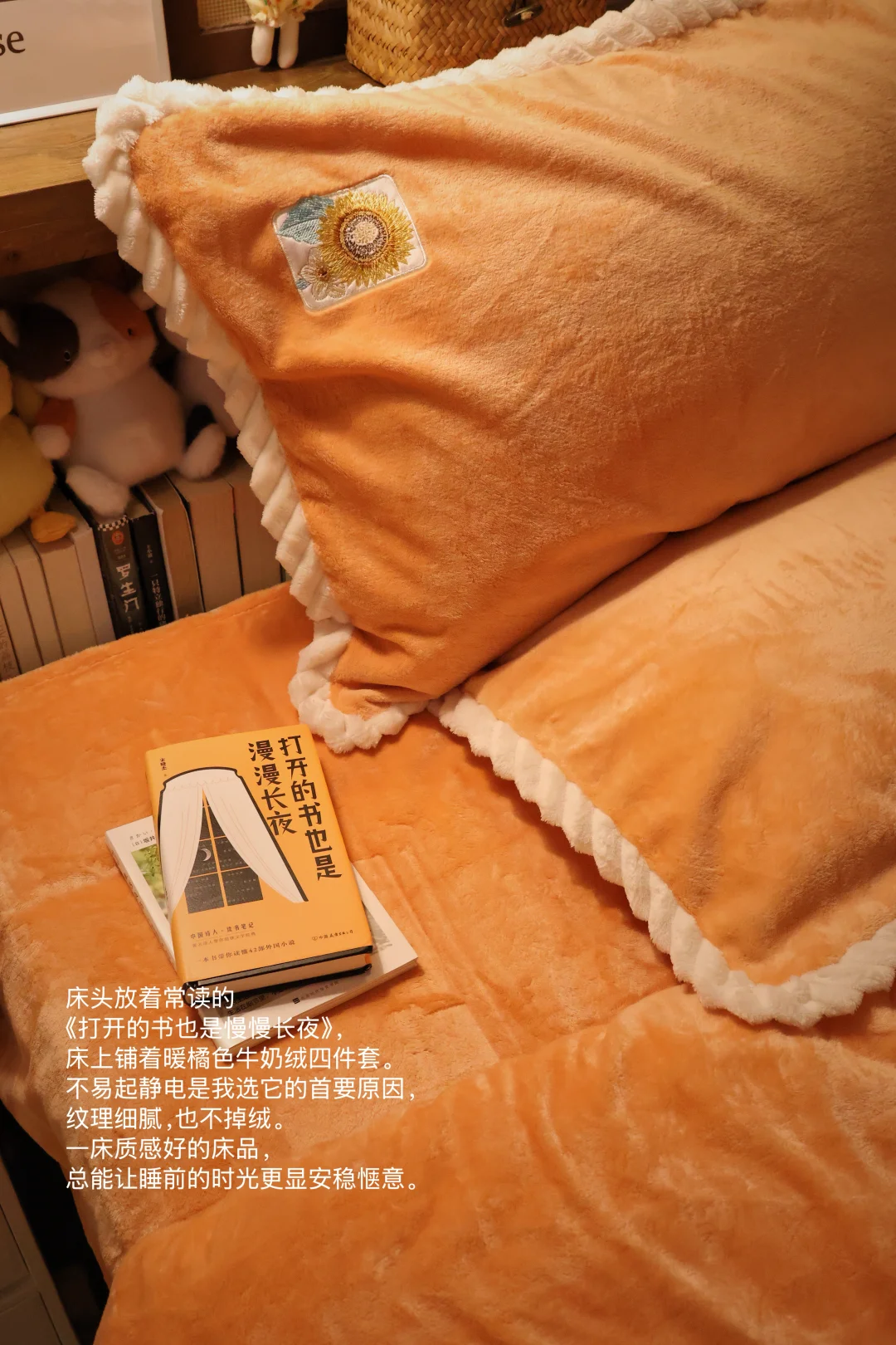 /分享我的暖冬10平小卧室布置小巧思༼⍤༽⬇️⬇️ *铺着牛奶绒的橘色小床铺 *一张1.4m的大书桌 *随时可以护肤的化妆角 *放满美食的小茶几 · 小床换上了冬日温暖的四件套 ——富安娜牛奶绒四件套 精致的向日葵刺绣🌻不失单调 高密牛奶绒不易掉毛 植入电导丝不易起电睡着更亲肤 · 床头有喜欢的读物 床边有柔软的抱枕 时而趴在床上写手帐 时而窝在被窝里阅读 · 日记里有很多个昨天 ·