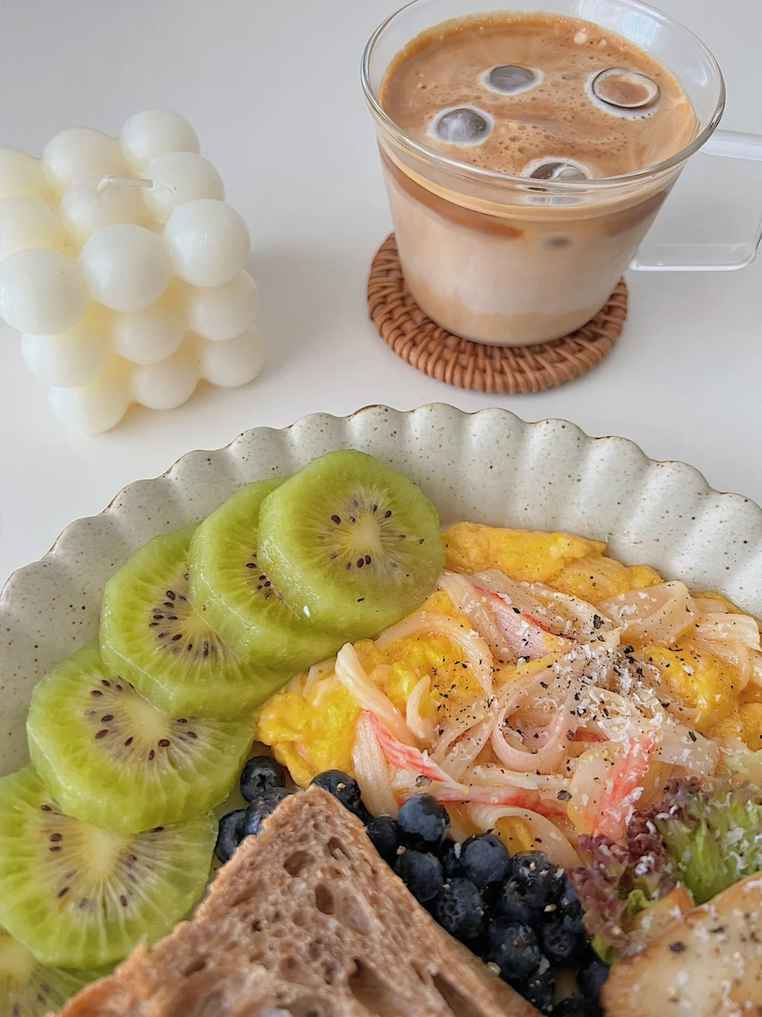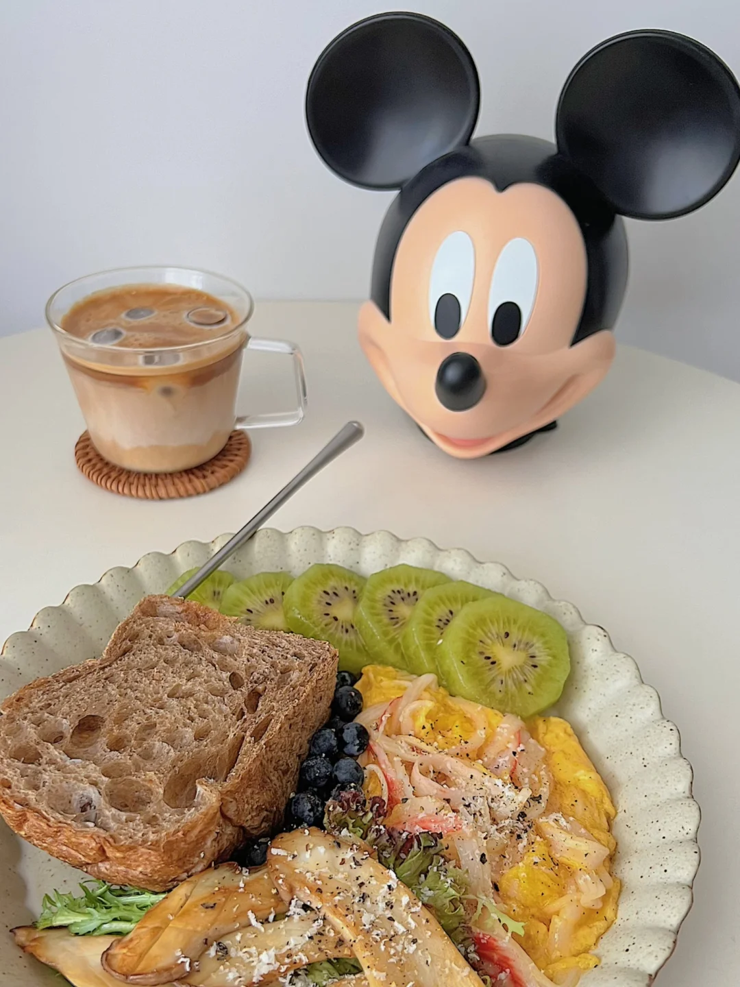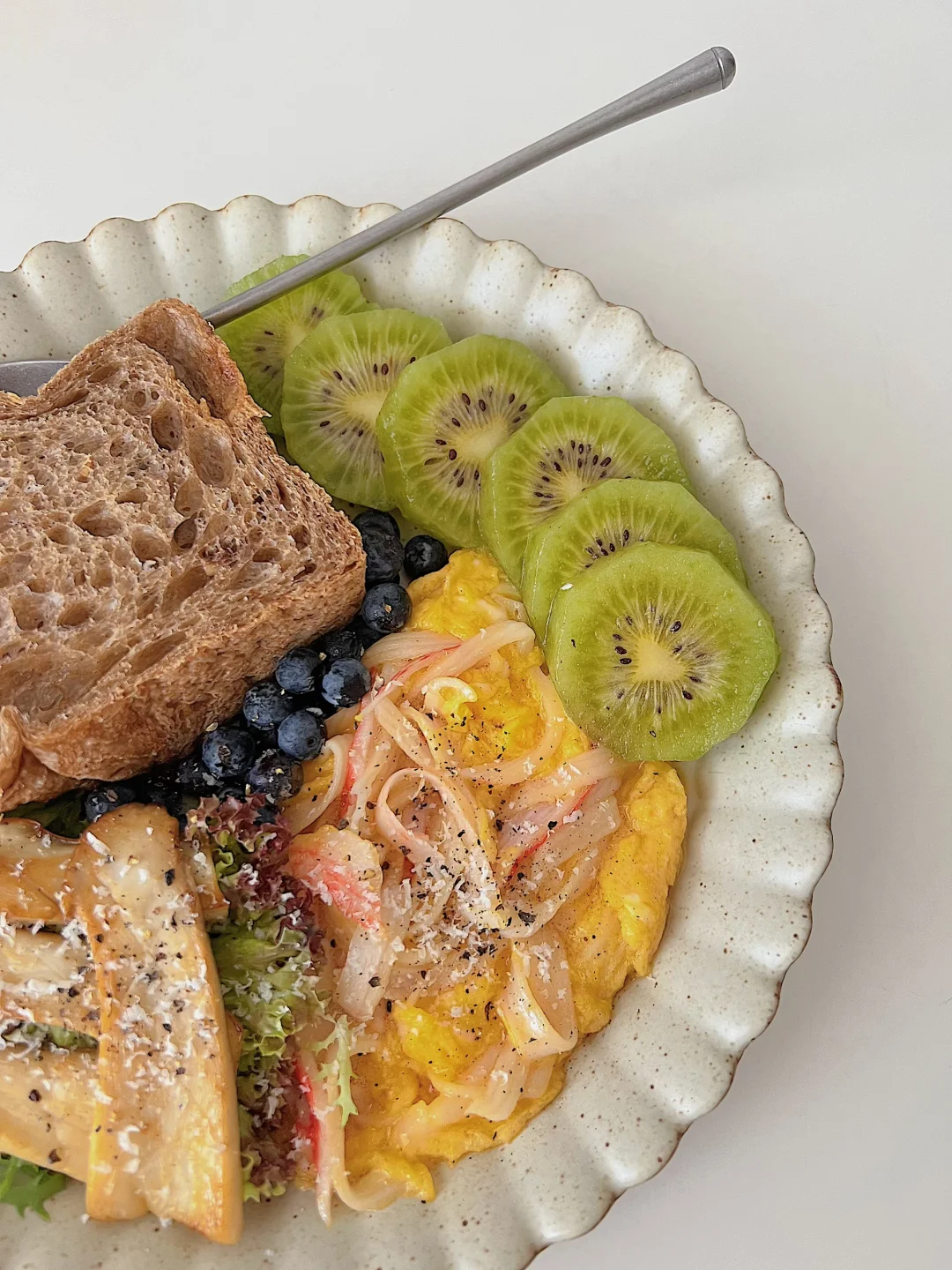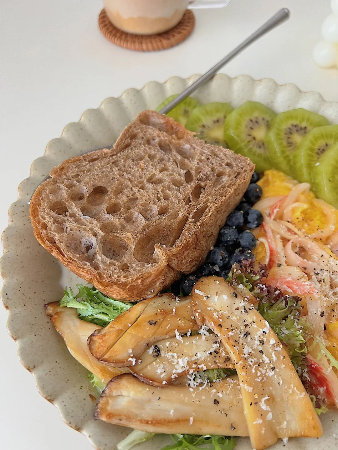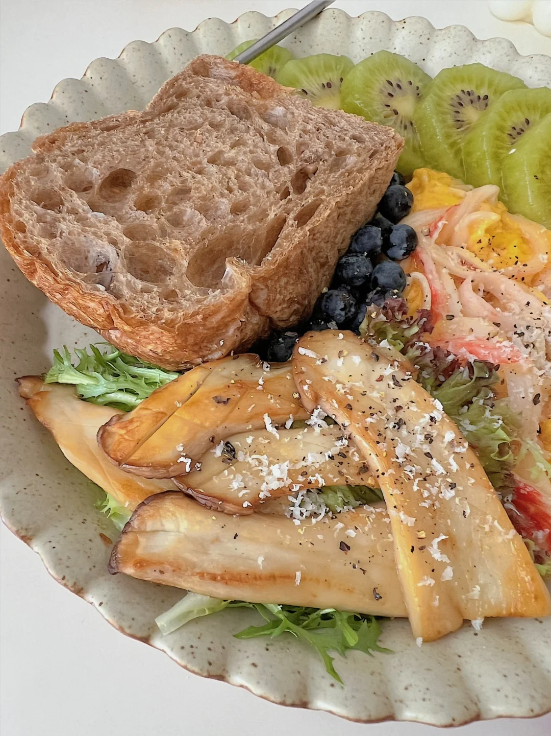 今天的拼盘: 吐司|奇异果🥝|蟹柳滑蛋|蓝莓🫐|沙拉菜|煎杏鲍菇|拿铁☕️ 杏鲍菇用黄油和黑胡椒盐煎,很香。