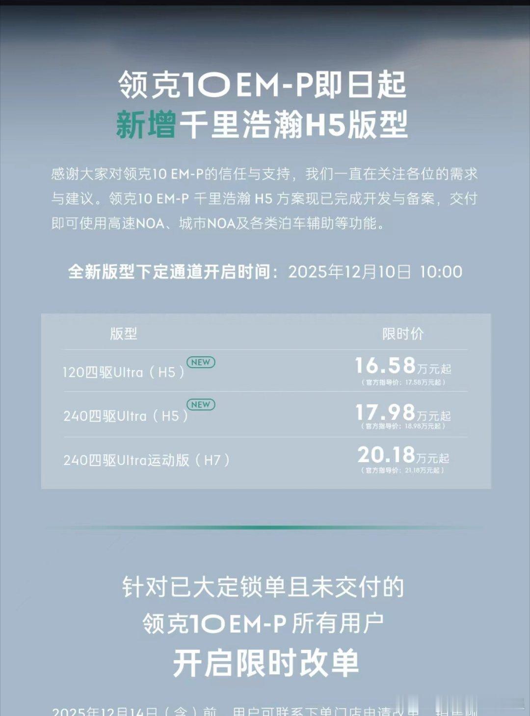 领克10EM-P销量快速突破2万高价值混动轿车首选大v聊车 领克10 EM-P上市三个月销量突破2万台,成为中大型混动轿车市场的现象级产品,其“入门即顶配”策略和新推出的智驾分级方案引发广泛关注。 一、销量表现与市场定位销量里程碑:自2025年9月8日上市至12月初,领克10 EM-P累计销量突破2万台,连续三个月稳居中大型插混轿车销量前三。11月单月销量达6,232台,超越同品牌热门车型领克08 EM-P(5,531台),成为领克品牌新销量支柱。 加权成交价近19万元,为细分市场前三名中均价最高的车型,印证其“高价值”定位。爆发式增长动因:配置越级:全系标配智能电混四驱、激光雷达、高通8295芯片及LYNK Flyme Auto 2座舱系统,以20万级价格提供30万级豪华配置,打破“顶配专属”传统认知。性能均衡:EM-P混动系统综合功率390kW、扭矩755N·m,零百加速5.1秒,CLTC亏电油耗仅4.2L/100km,纯电续航最高240km,兼顾性能与经济性。用户痛点精准解决:全场景续航无焦虑(综合续航1400km)、全铝底盘+液压可变阻尼悬架提升驾控质感,满足家庭用户与驾驶爱好者的双重需求。二、新增版型与智驾策略调千里浩瀚H5版型上线(2025年12月10日):价格下探:120四驱Ultra H5限时价16.58万元起,240四驱Ultra H5限时价17.98万元起,较原H7方案降价6000元。功能保留:交付即支持高速NOA、城市NOA及全场景泊车辅助,核心智驾体验未缩水。硬件调整:智驾芯片从Thor U更换为Orin Y,D2D/VLA大模型支持能力弱于H7,但算力仍满足基础需求,实现“高性价比智驾普惠”。用户灵活选择:已锁单未交付用户可在12月14日前申请免费改配H5版型,保留原权益。H5版型可选装H7方案(+6000元),顶配运动版也可选装H5方案,组合自由度提升。
