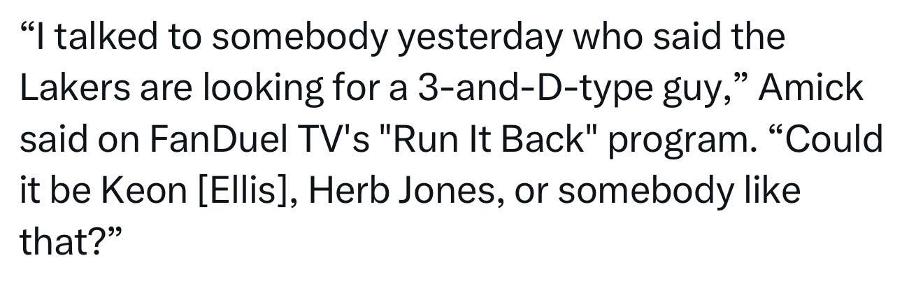 Sam Amick:“我昨天和一位知情人士聊过,他说湖人队正在寻找一名3D型球员。会不会是基恩·埃利斯、赫伯·琼斯,或者类似的球员?”