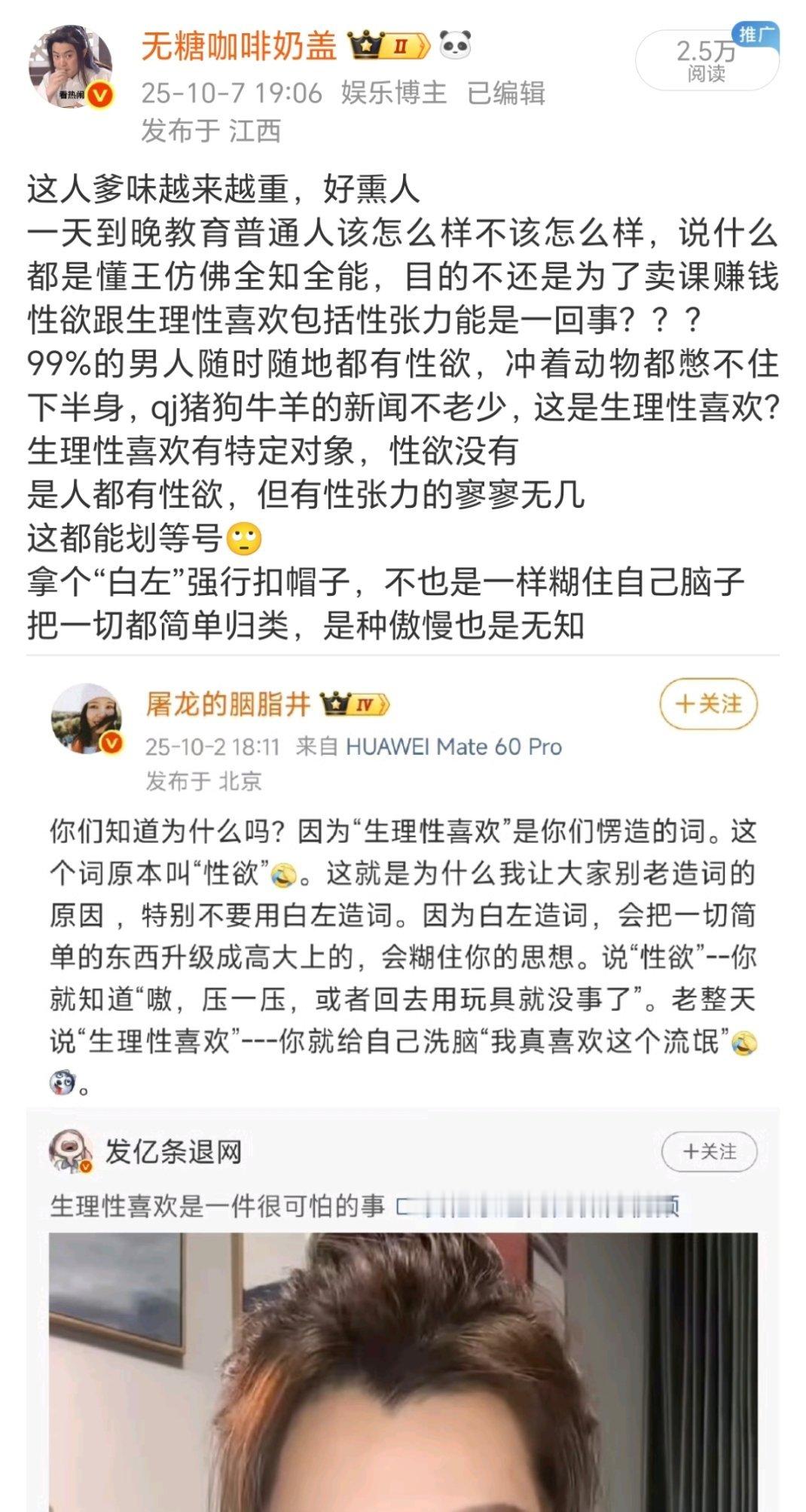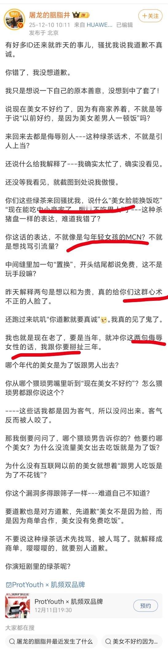 屠龙胭脂井这位女大爹也是绝了美女在自己微博说漂亮可以当饭吃,有很多探店商单。她看了不爽妒忌美女,想怎么可以有人靠脸就白吃,比她这个身高180清华学子留美博士年薪百万的成功人士女性楷模还要受优待一定是走偏门了!!!恶意满满还打着为普通人好教育大家不要学这位美女试图白薅店家羊毛,空口白牙造黄谣说还不如捞富二代冤大头🙄翻车破防还要继续狡辩,又假模假式上升高度好像自己苦口婆心劝年轻女性不要掉入陷阱,“捞富二代”“绿茶”“心术不正”,回头说别人用辱女词破防成这样也要继续当大爹,最后还要带上她那个割韭菜收智商税的护肤品打广告,low穿地心女大爹天天在普通人秀优越感,无时无刻不在装x,无论什么领域懂或不懂,用一堆看上去高大上狗屁不通强词夺理的话术包装,其实天天装逼不都是为了赚钱,还摆出这种高姿态🙄以前觉得只是过于傲慢,这一出完全看出来她对自己没尝试过的美女人生有多妒忌恨了