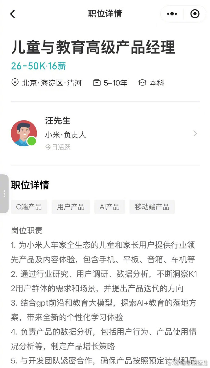 【#小米月薪最高5万招AI教育岗#】12月10日,界面新闻从BOSS直聘获悉,小米集团发布了多个AI教育相关岗位招聘需求,涵盖教研产品经理、儿童与教育高级产品经理、高级商务等职位,表明其有意涉足AI教育领域。从对应聘者要求来看,主要针对汉语言文学、数学、英语相关专业,具有五年以上相关学科教研经验,有在线教育、题库建设经验者优先。小米为该职位开出的薪资范围为26-50K*16薪。