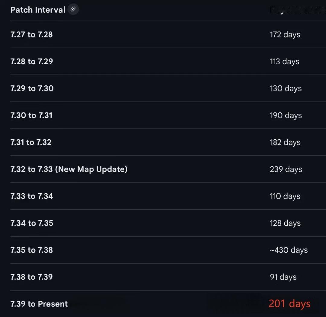 7.39版本自推出到今天已经持续201天了,最近的几个大版本更新只有7.32->7.33(地图外延、增加莲花池、双生之门等)的过度用时超过200天,其余版本更新均在200天以内完成,不知道7.40的更新是否会像当时7.33一样新增大量机制、颠覆游戏玩法