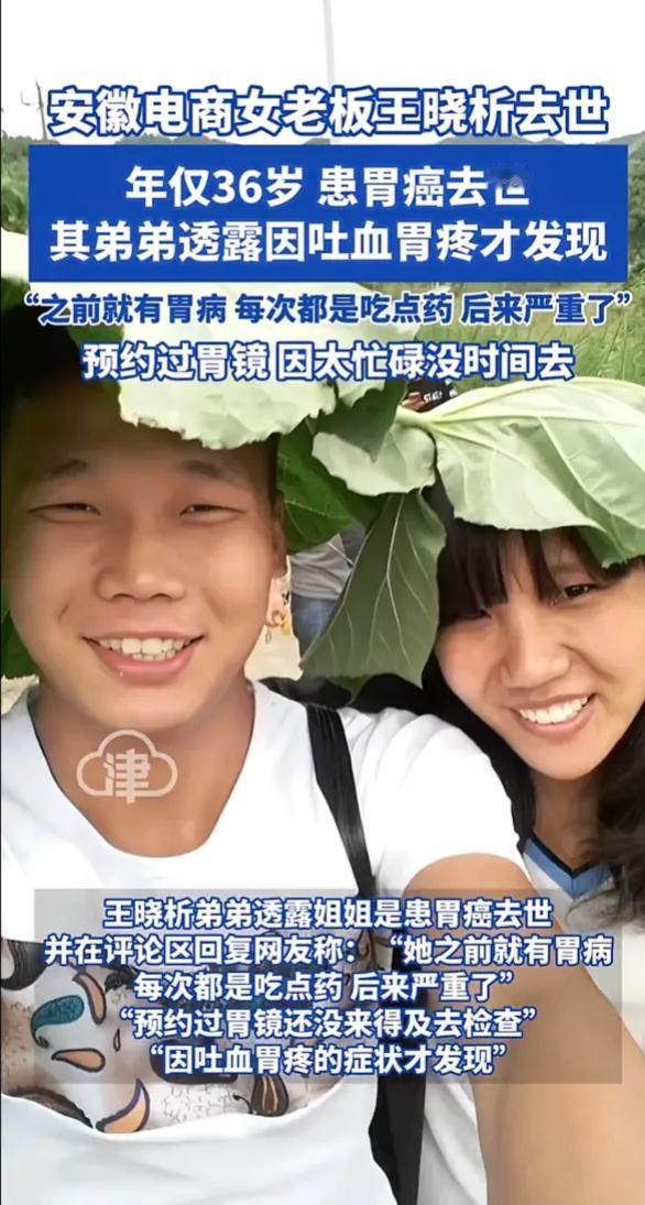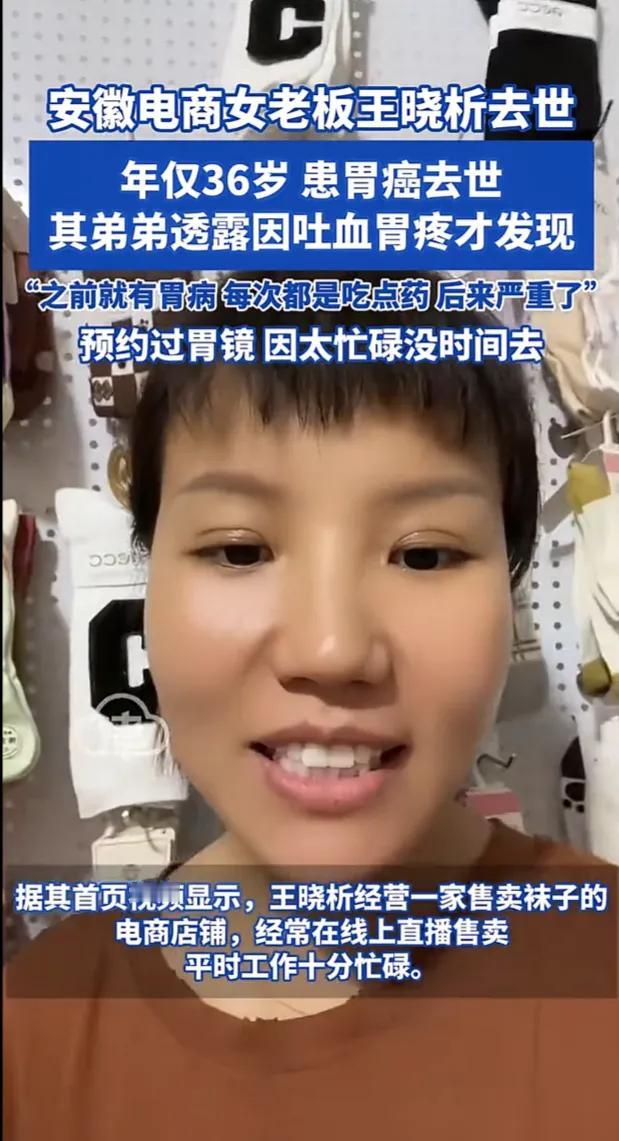钱再多又有什么用! 36岁安徽电商女老板去世了,她的死因,告诉所有人一个扎心的现实,拿身体换钱,得不偿失。 这事儿听着就堵得慌——36岁,正是能拼能闯的年纪,做电商老板肯定攒下不少家业,可身体一垮,什么都没了。她弟弟说,姐姐早就有胃病,疼起来就随便吃点药扛过去,连预约好的胃镜都因为“太忙”没顾上去。等到吐血、胃疼得扛不住了才去查,一查就是胃癌,这哪是“生病”,是身体被熬到撑不住了才亮的红灯。 咱们总说“先赚钱再养身体”,可真到了拼的时候,谁不是把“身体”当成不用充电的机器?做电商的人都知道,从选品、直播到打包发货,一天恨不得掰成48小时用,饭顾不上吃、觉凑活着睡是常事。她这胃病,八成就是常年饿一顿饱一顿、压力堆出来的——胃这东西最实在,你糊弄它,它早晚会给你“算账”。 最让人难受的是那句“预约过胃镜,太忙没时间去”。很多人都这样,身体有点小毛病总觉得“等忙完这阵再说”,可“忙完这阵”永远有下一阵。胃镜那几十分钟的时间挤不出来,最后却要拿一辈子的时间来换,这账怎么算都是亏的。 钱这东西,够花就行,可健康是“1”,后面的财富、事业都是“0”,没了这个“1”,再多“0”也没用。她这36年,可能赚了别人一辈子都赚不到的钱,可连好好吃一顿饭、睡个安稳觉的福气都没享到,多可惜啊。 现在年轻人总爱说“卷不动了”,其实不是躺平,是得明白:身体不是用来“换”钱的,是用来“扛着”生活往前走的。别等疼到受不了才想起去医院,别等攒够了钱却没机会花——你今天偷的懒、熬的夜、亏的饭,身体都一笔一笔记着呢。 各位读者你们怎么看?欢迎在评论区讨论。