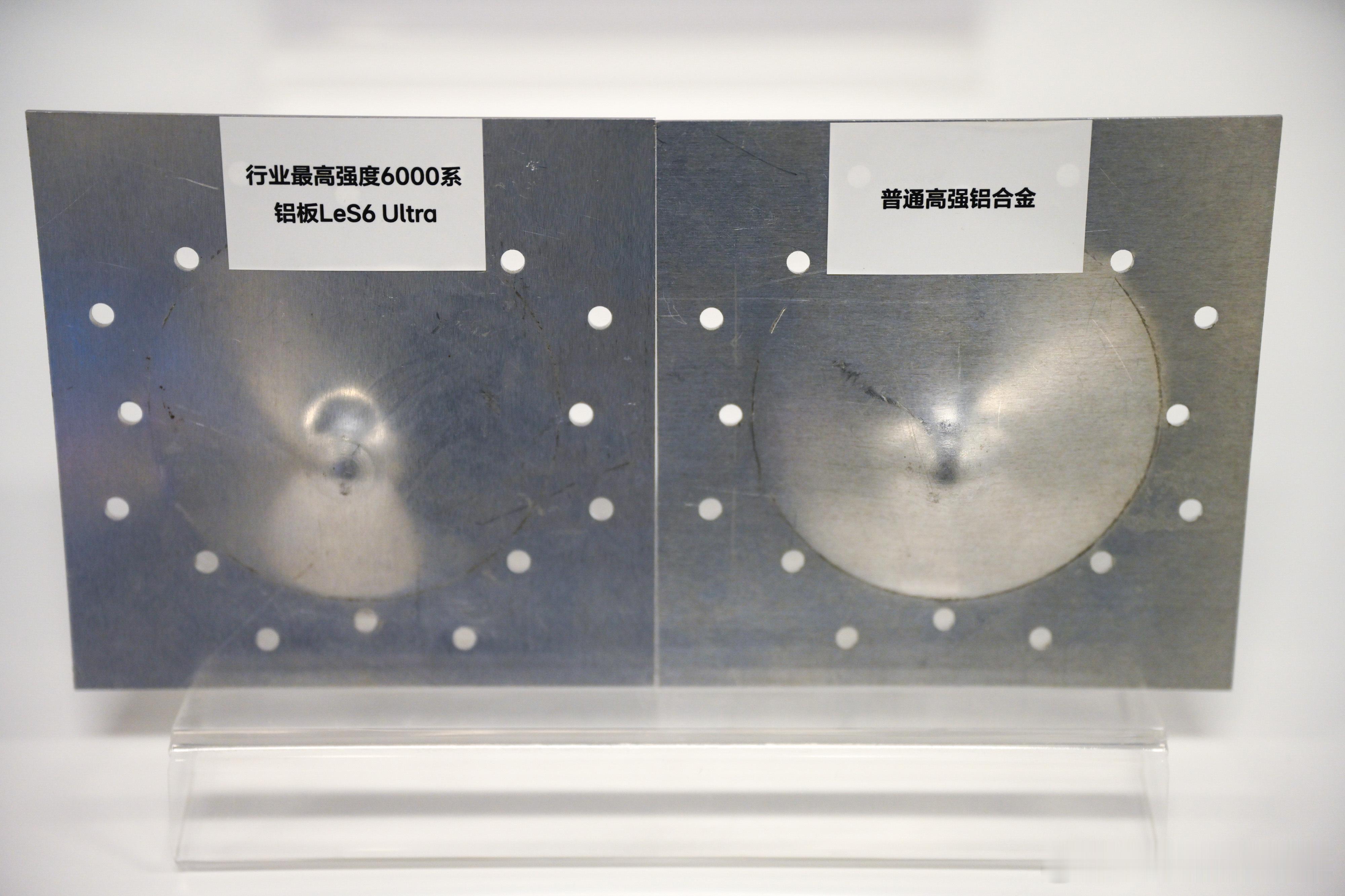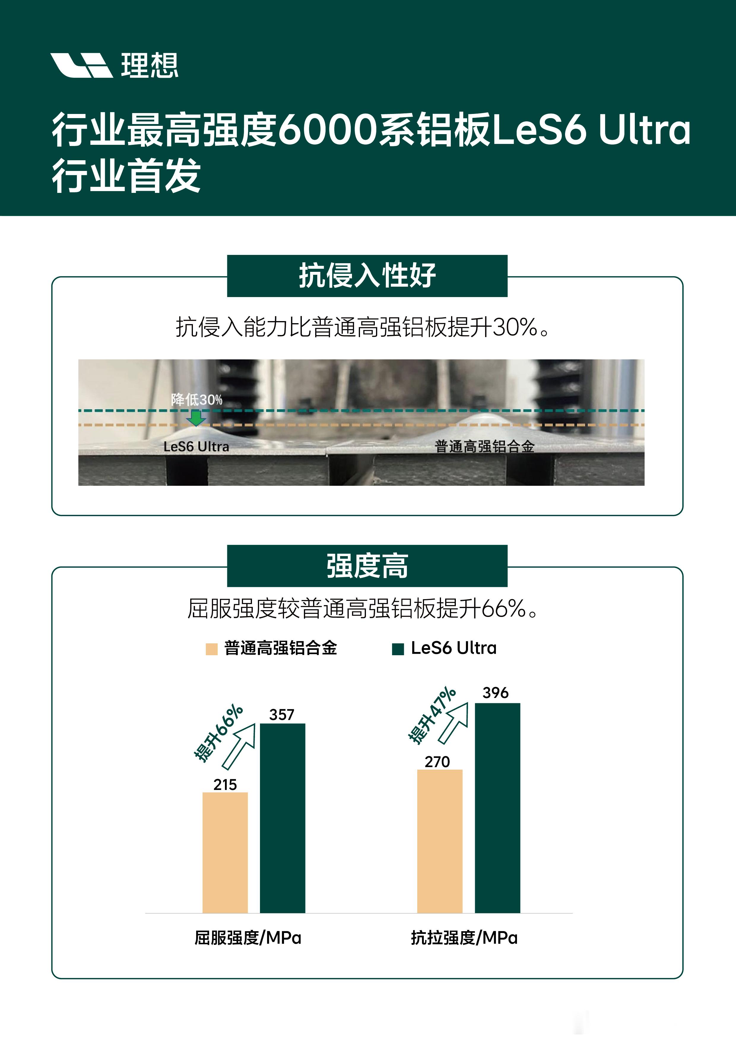 理想汽车与诺贝丽斯联合开发出了行业最高强度的6000系铝合金——LeS6 Ultra。它的屈服强度达到传统铝合金的3倍,是特斯拉使用的高强铝合金的1.66倍。落到实车层面,在电池底护板这一关键位置,在相同结构与等效冲击下,LeS6 Ultra的变形量比行业主流高强铝减少了30%,抗穿刺能力明显提升,为电池提供了更有效的保护。LeS6 Ultra已经在理想i6上率先量产,此前,LeS6 Max材料在理想MEGA上是用作地板加强件。汽场全开 理想材料研发成果大盘点