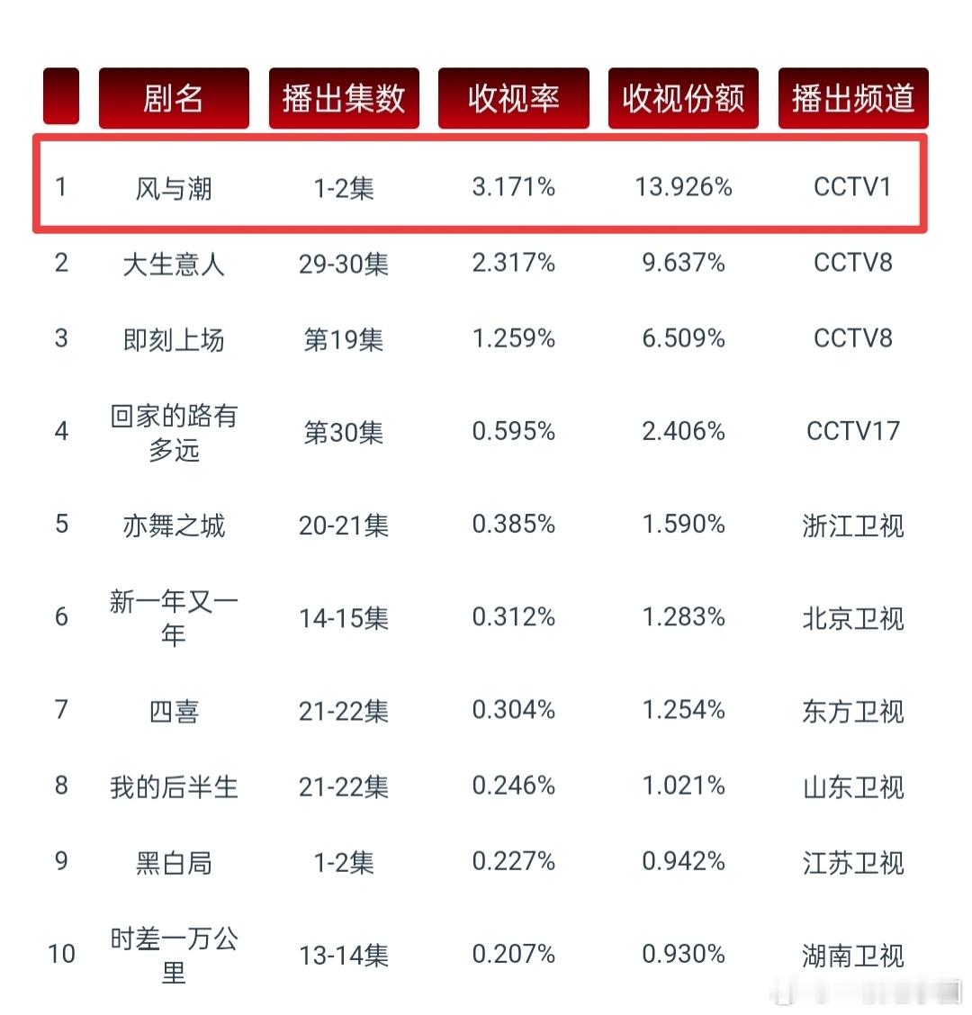 《风与潮》 CVB首播即破3.17!!!接倒一的盘,将央一CVB拉升至【下半年第一】!!强势高开🔥🔥🔥,首播即王炸💥💥💥!任嘉伦在正剧赛道的号召力同样牛比🐮🐮!!