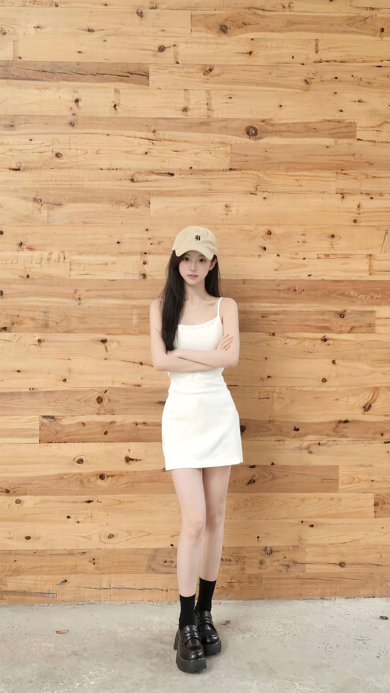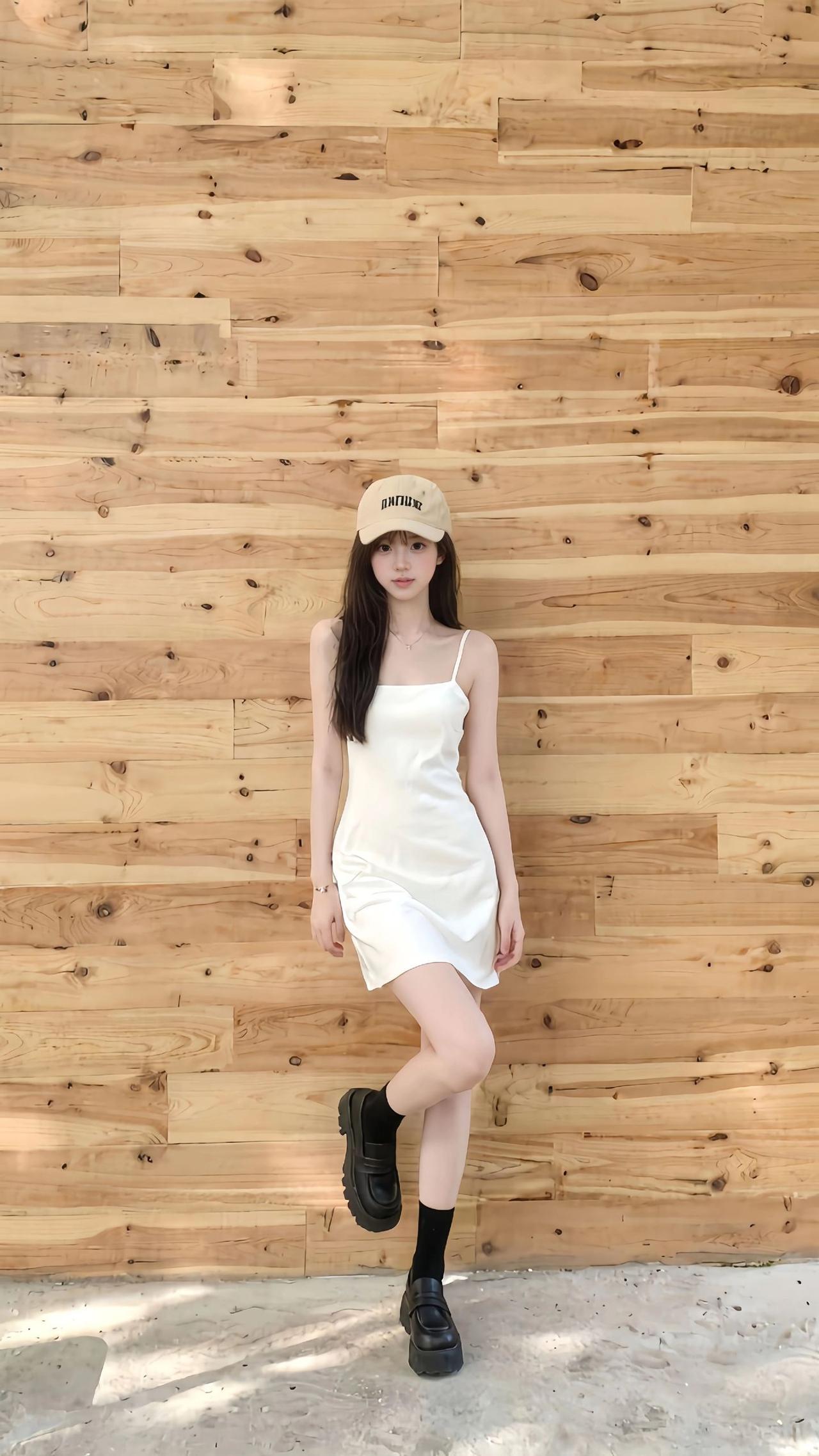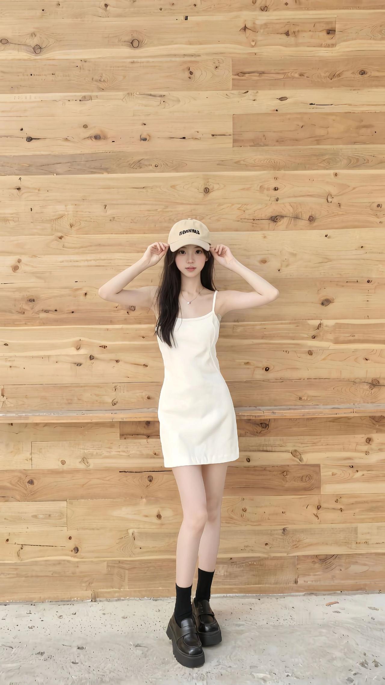 夏日清新穿搭,白色连衣裙搭配米色棒球帽,轻松自在。