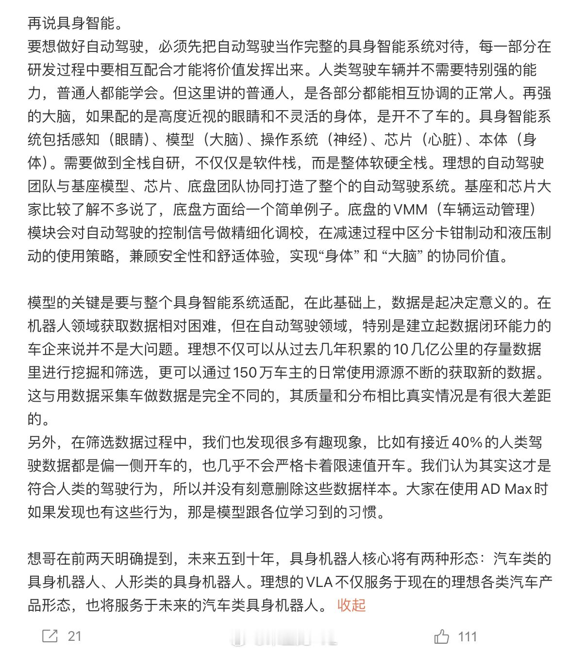 理想高管回应王兴兴质疑 技术路线之争,是大道之争。今天理想汽车自动驾驶研发高级副总裁郎咸朋回应王兴质疑的观点。微博上说了几个观点,他认为VLA就是自动驾驶最好的模型方案;具身智能最终拼的是整体系统能力;模型必须和整个具身智能系统适配,而数据决定一切。现在做辅助驾驶、L4Robotaxi和做机器人(具身智能)的几波人对方法论开始有了讨论和探讨,这客观来说是技术路线竞争现状。从理想的角度来看,最拿得出手的就是辅助驾驶的迭代和进步,就是 VLA 司机大模型的能力增强了,红灯刹停更稳、更早、更自然。这里底层的更新是视觉感知从 1K 升级到 2K,识别距离从 100 米直接干到 200 米。车看得更远,模型理解得更快,所以刹得更稳,模型是大脑,但大脑能不能发挥作用,要看整个身体是否协同。从这个角度来看,VLA 是不是现在好的路线,理想汽车是非常坚持的,因为能理解世界、能持续进化、能跟理想的自研感知、自研芯片、自研操作系统深度适配。当然这个路线之争还会持续,要看2026年各家的表现,说实话昨天地平线把10万的城市NOA也卷起来了,到时候20万以上的车型需要更好的体验才能拉开差距。