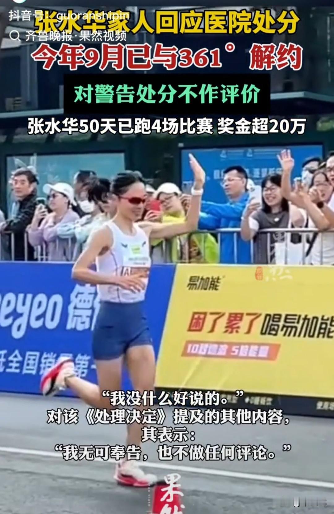 50天连跑5场马拉松,号称“跑得最快女护士”的张水华受到医院处分了。 从今年10月19日,张水华经历舆论风波后首次重返赛场,她的状态好得惊人,屡屡刷新个人最佳。 从成绩上看,张水华已经具备了职业运动员的实力,她的个人最好成绩是2小时30分38秒,远超国家级运动健将标准(2小时34分)。 她的成绩越好,网友们对她的质疑越大,因为她所做的一切,都绕不开一个最根本的身份,她是一名护士。 一名护士,50天内参加5场高强度的马拉松比赛,加上舟车劳顿,赛前训练,赛后恢复,时间和体力的消耗只会成倍上升。 频繁的异地参赛和必要的恢复训练和休息,与需要“三班倒”、排班固定、一个萝卜一个坑的护士工作模式,存在着根本性矛盾。 当个人的比赛安排常态化,就需要同事频繁代班和科室临时调整人力,就会打乱整个科室护理工作安排。 所以,对她说的“完全不影响工作,都是利用休息时间”,网友们觉得难以置信。 在现实中,爱好和职业真的可以如此完美地切割吗。 当个人把业余爱好推到极致,业余爱好的频率和强度已经远超普通业余爱好,越来越接近职业运动员的参赛节奏时,业余爱好和本职工作之间,不可避免的会存在现实冲突。 这种冲突不是源于个人能力,而是制度、规则和时间精力分配上的矛盾。 想想那个得了癌症,请病假去化疗都不获批准的护士。 一个是业余爱好,几场比赛就可以赚取当护士一年都赚不到的收入。 一个是得了危及生命的癌症,请个病假都不否批准。 二者的待遇,可谓是天壤之别,让人不胜唏嘘。 希望张水华能清晰界定不同场景下的角色,让两者都能兼顾,真正做到工作、生活两不误。 (素材来源:果然视频)