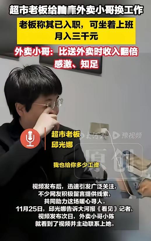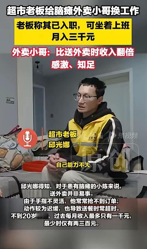 江苏宿迁超市一老板邱光娜,由于一时疏忽让一外卖员在店内白白等了很久,她感到十分愧疚,果断发布寻人启事,寻找这位残疾外卖小哥,哪料见面后才发现,这位19岁小伙因脑瘫求职屡屡碰壁,月收入曾低至两三百元,没想到邱光娜的一个决定,不仅让他重获工作,还意外点燃了更多希望。 邱光娜不算精明的生意人,对熟客多给一把葱,对老人多耐心算一遍账,超市不大,琐事却杂,从早到晚忙得脚不沾地,却没曾想,一次无心的失误,竟成了一场善意的开端。 那天傍晚关店,邱光娜像往常一样翻看着监控复盘,目光忽然停在一个迟缓的身影上。那是个外卖小哥,走路摇摇晃晃,手臂僵硬地夹着外卖箱,每一步都走得格外吃力,不像在赶路,倒像在与自己的身体较劲。 她心里猛地一沉,忽然想起中午那笔没联系上骑手的订单——原来不是骑手失约,是自己忙乱中把手机调成了飞行模式,没接到消息,让这个小伙子在店里硬生生等了十几分钟,错过了订单,也错过了本该到手的收入。 监控里,少年站在货架旁,手指无意识地抠着外卖箱的带子,眼神慌乱又无措,没有抱怨,也没有催促,就那样安静地等着,直到最后慢慢转身,笨拙地走出超市。邱光娜看着那背影,心里像被什么东西堵着,又酸又涩。 她见过太多为生活奔波的人,却没见过这样拼尽全力,却连“按时送达”都成了奢望的孩子。当晚,她把监控截图发到本地社群,没有华丽的措辞,只写了一句:“因我的疏忽,让一位行动不便的外卖小哥白等了许久,心里愧疚,想找到他,当面道个歉。” 她没指望有多大动静,却没想到,这条朴素的消息,一夜之间在宿迁传开了。第二天一早,一个结巴又怯懦的声音打了过来,电话那头的少年说,他叫小陈,今年十九岁,是那个被耽误的外卖员。 直到这时,邱光娜才知道小陈的处境。天生脑瘫让他肢体不协调,手指僵硬到连手机抢单都慢半拍,送外卖时,别人半小时能跑三单,他一小时只能跑一单,超时、差评是常态,一个月拼尽全力,也只能赚两三百块,连温饱都勉强维持。 他试过找其他兼职,工厂嫌他手脚慢,餐馆嫌他动作笨,一次次被拒绝后,才鼓起勇气送外卖,哪怕每天被风吹日晒,哪怕偶尔被顾客催促,他也不想伸手乞讨,只想靠自己的力气活下去。 听着小陈断断续续的讲述,邱光娜的愧疚更甚,却也被这份笨拙的坚韧深深打动。她见过太多人在苦难面前退缩,却没见过这样一个被命运苛待的孩子,依然在拼命抓住生活的稻草。 “你来我超市上班吧。”邱光娜没多想,脱口而出。她没给小陈安排繁重的活,只让他在门口核对购物小票,坐着就能完成,工资和其他员工一样,不打折扣,不搞特殊。 小陈起初是犹豫的,声音里满是不自信:“老、老板,我怕我做、做不好,给你添、添麻烦。”邱光娜看着他泛红的眼睛,语气平和却坚定:“慢不怕,认真就好,我不求你快,只求你安心。” 就这样,小陈成了超市门口的“小票核对员”。邱光娜特意给她找了一把舒服的椅子,还准备了放大镜,怕他看不清小票上的小字;遇到顾客催促,她总会笑着解围:“这小伙子看得仔细,多等两秒,买得放心。” 刚开始,小陈总是低着头,说话结巴,面对顾客的目光会下意识躲闪。可日子久了,看着邱光娜的包容,看着顾客们善意的眼神,他慢慢放开了,核对小票时越来越熟练,脸上也渐渐有了笑容,偶尔还会主动和熟客打招呼,声音虽依旧结巴,却多了几分底气。 有网友说,邱光娜做的不过是一件小事,可就是这件小事,给了小陈活下去的尊严。是啊,对我们而言,一份普通的工作或许不值一提,但对小陈来说,这不仅是一份收入,是不用再被拒绝的底气,是不用再看别人脸色的体面,更是来自陌生人最温暖的救赎。 如今,邱光娜的小超市,成了宿迁街头的“温暖地标”。不少人特意绕路过来购物,不是因为超市的商品有多特别,而是想看看那个认真核对小票的少年,想给这份善意多一份支持。 有人说,生意做得好的人,大多心有温度。邱光娜没有惊天动地的壮举,只是在发现自己的疏忽后,没有选择视而不见;只是在看到别人的困境时,没有选择袖手旁观。这份善意,像冬日里的一束光,暖了小陈,也暖了这座城。 宿迁的冬天依旧寒风刺骨,但超市门口的那盏灯,那个迟缓却认真的身影,那句结巴却真诚的“您好,请出示小票”,总能让路过的人停下脚步,心里生出几分暖意。 这世间最动人的,从来不是锦上添花,而是雪中送炭。一份包容,一份接纳,就能让一个被生活压得抬不起头的人,重新找回面对生活的勇气。 对此,大家有什么看法呢?