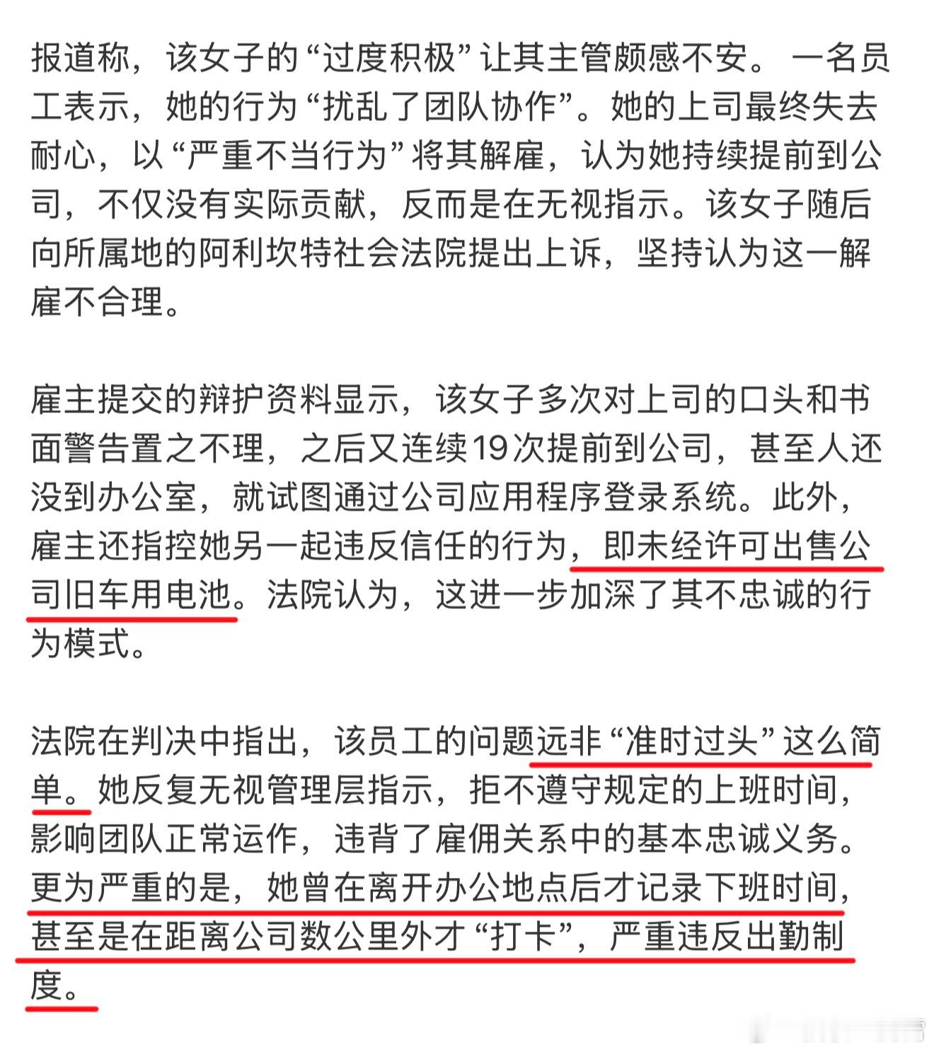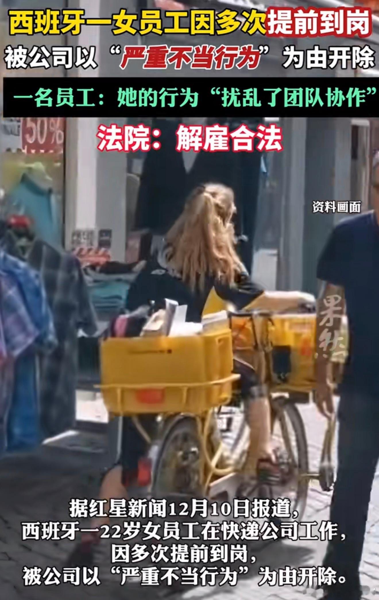 这些个媒体成天就想着搞大新闻,刚看到西班牙女员工连续提前到岗被开除这话题,我还寻思那么魔幻,就因为早到公司给开除了。仔细一看压根不是这原因,这员工未经许可出售公司旧车用电池,并且还多次在距公司数公里外才打卡下班,这换哪家公司都得把她开除了吧