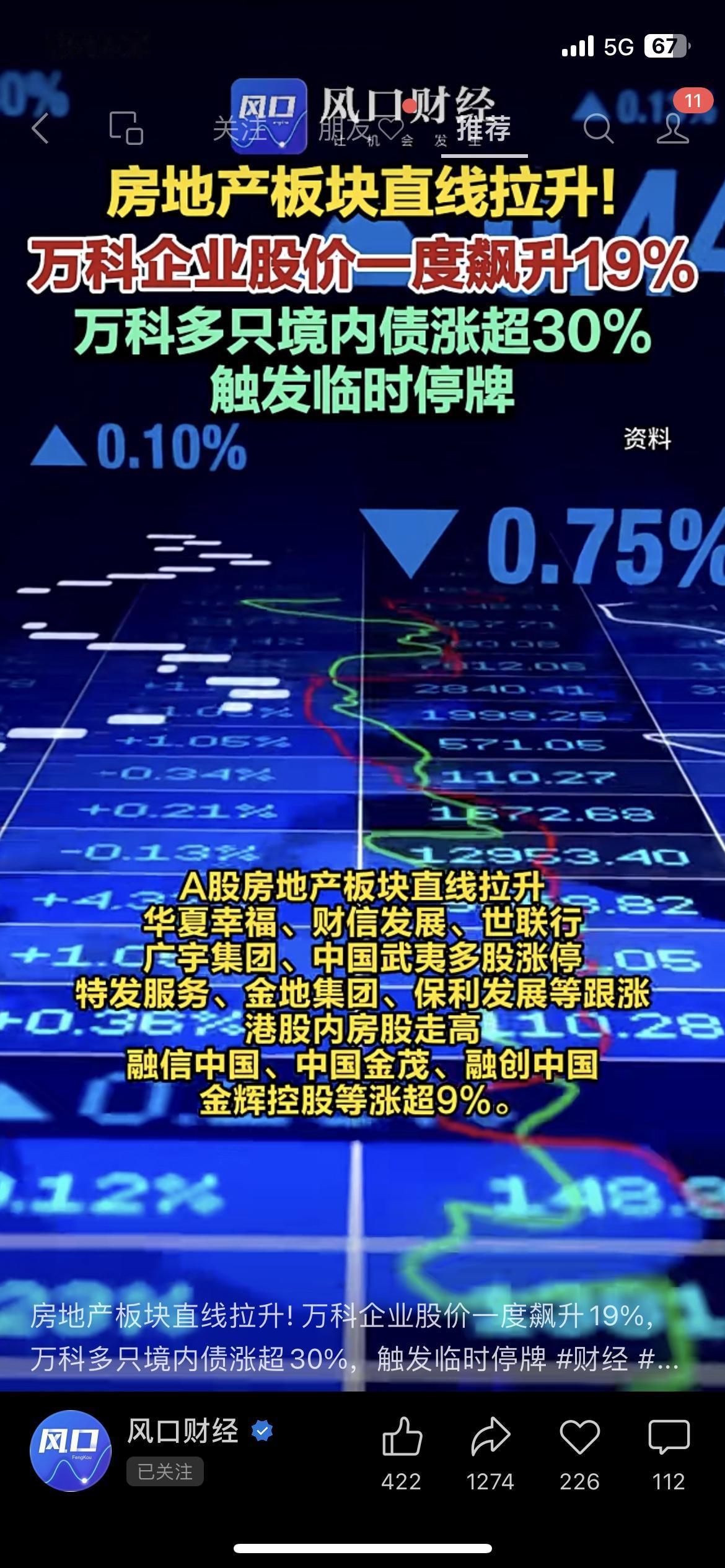 刚刷到赶紧分享!万科今天的行情也太猛了!港股股价一度飙了19%,A股直接触板,成交额超17亿,就连“22万科06”“22万科04”这些境内债都涨超20%,直接触发临时停牌,整个地产板块也跟着嗨,A股多只地产股涨停,港股内房股涨幅也超9%。咱普通人可得拎清,这是股市行情,跟房价涨跌没关系,刚需别慌着买房,持仓的也别盲目操作。你们觉得这波地产股涨势能持续多久?刚需现在入手房子合适不?万科