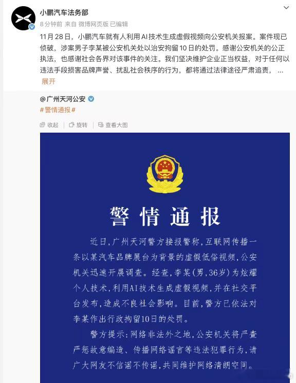 造谣的被抓了。广州市公安局天河分局12月10日通报,经查,李某(男,36岁)为炫耀个人技术,利用AI技术生成虚假视频,并在社交平台发布,造成不良社会影响。目前,警方已依法对李某作出行政拘留10日的处罚。不得不说,这AI还挺逼真的,根本分辨不出来真的假的。还记得11月底,这个视频在各个群里面转发。警方通报小鹏广州车展展台虚假ai视频事件全网热点共创计划