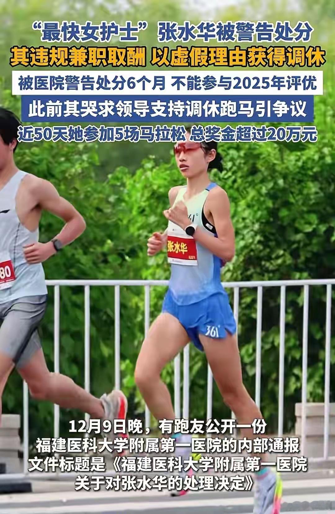 医院回应最快女护士张水华被处分医院的处分文件显示,张水华主要存在两大问题:违规兼职获得报酬和以虚假理由申请调休。兼职取酬医院应该早就知道了,真正让医院愤怒的应该是通过欺骗手段申请调休,并立马又参加了马拉松。她之前已经参加过很多次马拉松,说明医院还是很包容她的,这次估计太过分了,居然通过欺骗的手段去忽悠科室和同事,如果每个人都像她这样外出兼职,那医院管理岂不乱套了?既然有这个实力,建议从医院辞职,专心去跑马拉松吧!热点观点