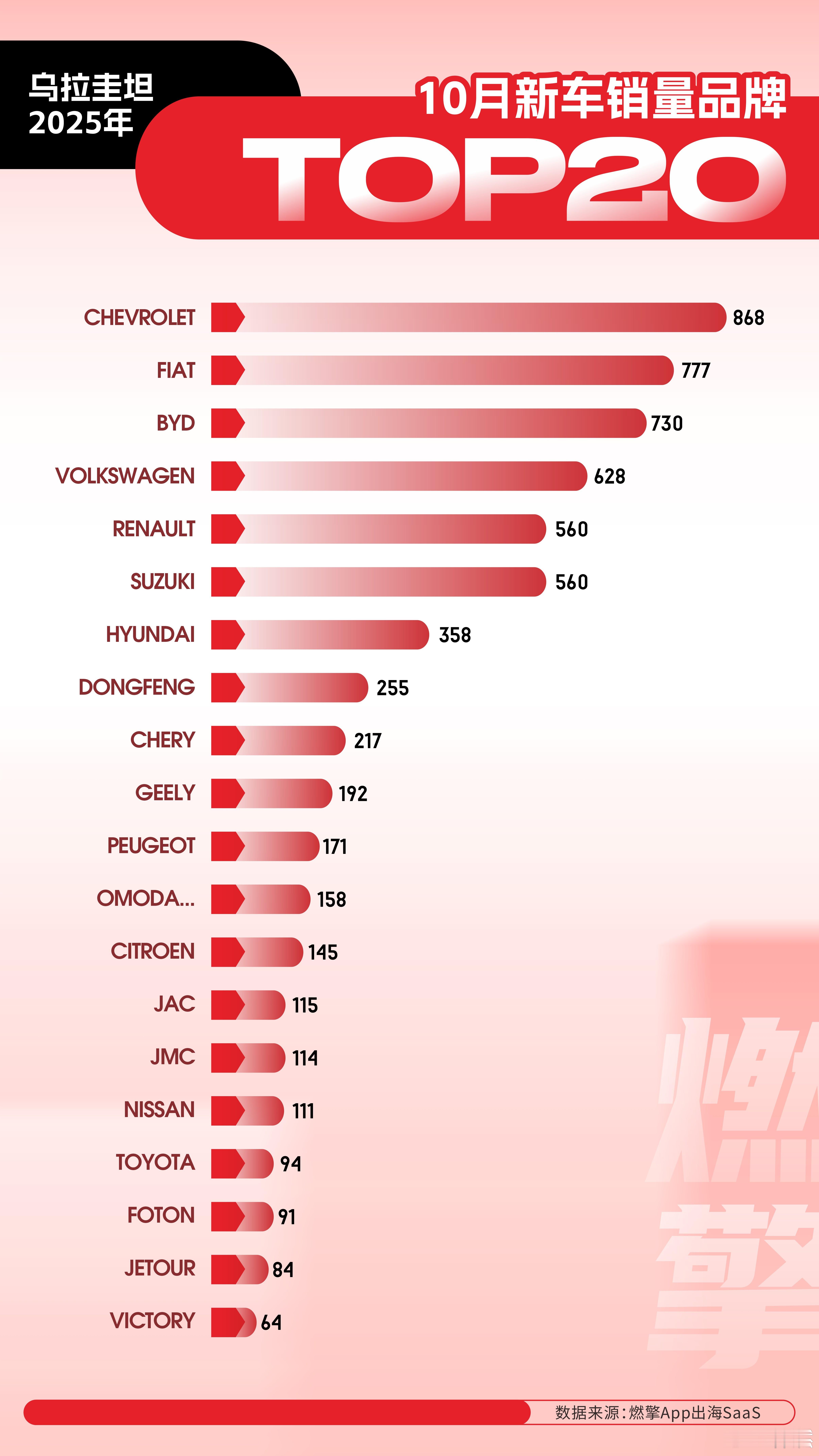 乌拉圭新车市场,比亚迪表现尤为突出10月,乌拉圭新车市场呈现出多元品牌竞争的格局。美系及欧系传统品牌凭借长期积累的优势保持领先,而中国品牌,尤其是比亚迪,实现了显著突破,市场份额快速提升。这反映出当地消费者对满足日常通勤、注重性价比的家用车型的稳定需求。雪佛兰以868辆的月销量位居榜首,其经济型轿车产品线,如科鲁兹等,凭借可靠的性能与合理的价格,长期服务于乌拉圭城市通勤市场。菲亚特以777辆的销量紧随其后,其小型家用车型精准契合当地家庭的日常出行需求。大众、雷诺等欧系品牌也分别以628辆和560辆的销量,依靠经典的家用车型在中端市场占据一席之地。中国品牌中,比亚迪的表现尤为突出,以730辆的销量位列第三,与第二名的差距仅为47辆。其宋系列、海豚等家用车型,在提供实用空间和丰富配置的同时,保持了具有竞争力的价格,精准匹配了乌拉圭消费者对高性价比产品的偏好,成功进入市场头部阵营。此外,东风、奇瑞、吉利等中国品牌也逐步打开市场,分别以255辆、217辆和192辆的销量,凭借经济型SUV及轿车产品,在入门级家用市场获得认可。尽管当前销量规模仍有提升空间,但已形成多品牌协同布局的初步态势。相比之下,部分日韩系品牌如现代(358辆)、日产(111辆)和丰田(94辆)的市场表现相对平淡。这在一定程度上表明,其现有产品在乌拉圭市场的性价比竞争力有待加强,同时面临来自传统欧美品牌与中国品牌的双重市场压力。展望未来,比亚迪的市场份额有望继续增长,若能进一步完善本地售后服务网络,其排名存在进一步提升的可能。其他中国品牌如能推出更贴合当地家庭使用场景的车型,市场渗透速度或将加快。尽管雪佛兰、菲亚特等传统品牌的领先地位在短期内预计保持稳定,但其部分市场份额可能面临以比亚迪为代表的中国品牌的持续竞争与分流。大v聊车
