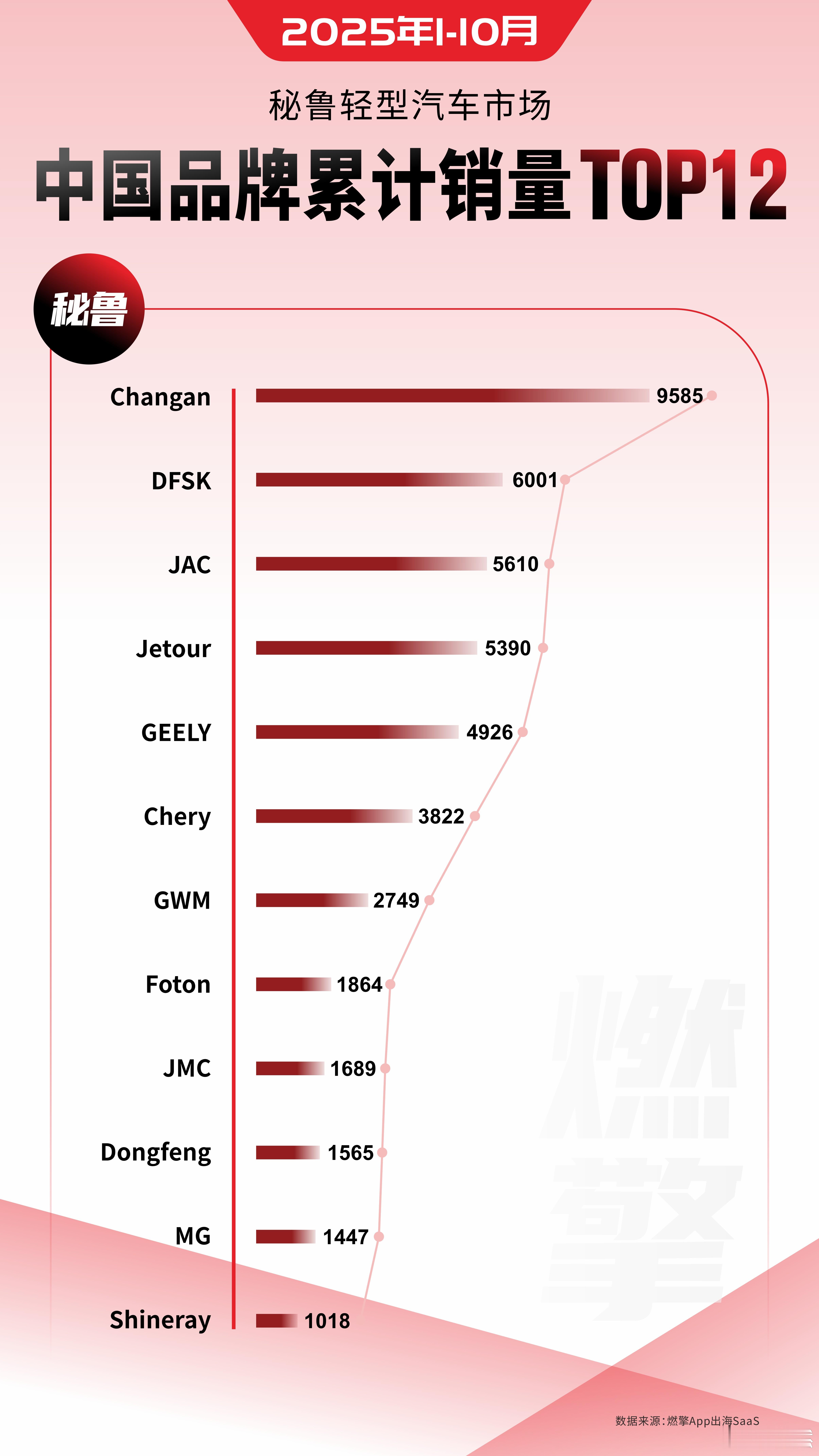 秘鲁轻型汽车市:长安位居中国品牌首位1-10月,中国汽车品牌在秘鲁轻型汽车市场展现出全面而深入的布局。以长安为引领,各品牌通过差异化的产品定位,精准契合了当地复杂的山地路况以及家用与商用并重的市场需求,形成了清晰的市场梯队。在主力阵营中,长安以9585辆的累计销量位居中国品牌首位,其CS系列等经济型SUV凭借良好的道路通过性和实用空间,成功满足了家庭用户在多山地形的出行需求。DFSK与江淮分别以6001辆和5610辆的销量,专注于轻型商用车领域,有效服务了小规模商业运营和短途物流的刚性需求。捷途和吉利则分别以5390辆和4926辆的销量,凭借高性价比优势,在入门级家用车市场占据了稳固地位。这五大品牌共同构成了中国品牌在秘鲁市场的核心力量。在细分市场,奇瑞与长城汽车分别以3822辆和2749辆的销量,通过SUV产品线覆盖了家庭出行及轻度越野场景。福田、JMC和东风等品牌则延续了其在商用车领域的传统优势,服务于不同层级的货物运输需求。此外,MG以1447辆的销量凭借年轻化设计吸引都市通勤群体,Shineray则以1018辆的销量聚焦于入门级商用车型,进一步完善了市场覆盖。中国品牌在秘鲁市场的成功,关键在于其精准的产品策略:一方面,针对多山地形主推具备高通过性的SUV车型;另一方面,通过明确区隔的家用与商用产品线,以突出的性价比优势,有效承接了市场多样化的刚性需求,并对传统国际品牌份额形成了分流。大v聊车
