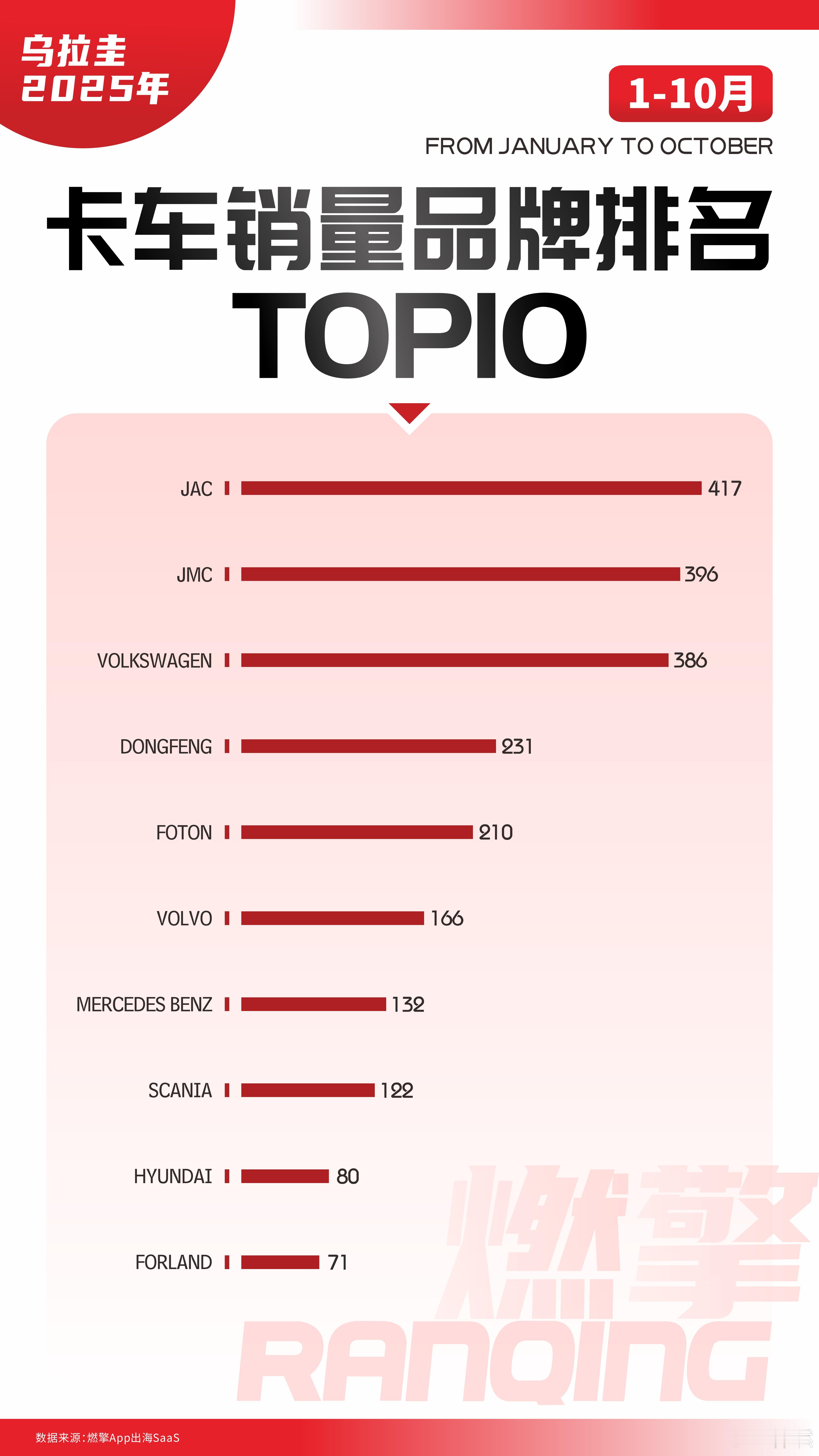 乌拉圭卡车市场:江淮高居榜首1-10月,乌拉圭卡车市场呈现出鲜明的竞争格局。中国商用车品牌凭借对当地核心需求的精准把握占据领先地位,欧系豪华品牌固守高端细分市场,而部分传统品牌的份额则面临挤压,整体市场呈现出明显的性价比导向和实用主义特征。中国商用车品牌在本期榜单中表现突出,占据了销量前五名中的四席。JAC以417辆的累计销量位居榜首,JMC以396辆紧随其后。这两个品牌主要凭借其中轻型卡车产品,精准满足了乌拉圭农业运输及城市短途物流等中小型货运场景的刚性需求。东风和福田也分别以231辆和210辆的销量,凭借在承载能力与价格上的综合优势,共同满足了市场对实用型卡车的广泛需求。中国品牌已成为乌拉圭卡车市场最主要的供给力量。欧系豪华品牌方面,沃尔沃、奔驰和斯堪尼亚分别以166辆、132辆和122辆的销量,专注于服务大型物流企业的长途重型货运需求。由于其产品定位高端、价格较高且应用场景相对特定,这些品牌在销量规模上处于市场小众位置。传统品牌中,大众以386辆的销量位居第三,其卡车产品在部分商用领域仍占有一席之地,但销量已被领先的中国品牌超越。现代则以80辆的销量处于榜单后段,反映出传统品牌在性价比维度与中国品牌竞争时所面临的压力。展望未来,中国商用车品牌在乌拉圭市场的领先地位预计将进一步巩固。欧系豪华品牌预计将维持其在高端细分市场的稳定格局。而对于大众等传统品牌而言,其市场份额可能持续面临中国品牌的价格与产品适配性优势所带来的竞争压力。大v聊车