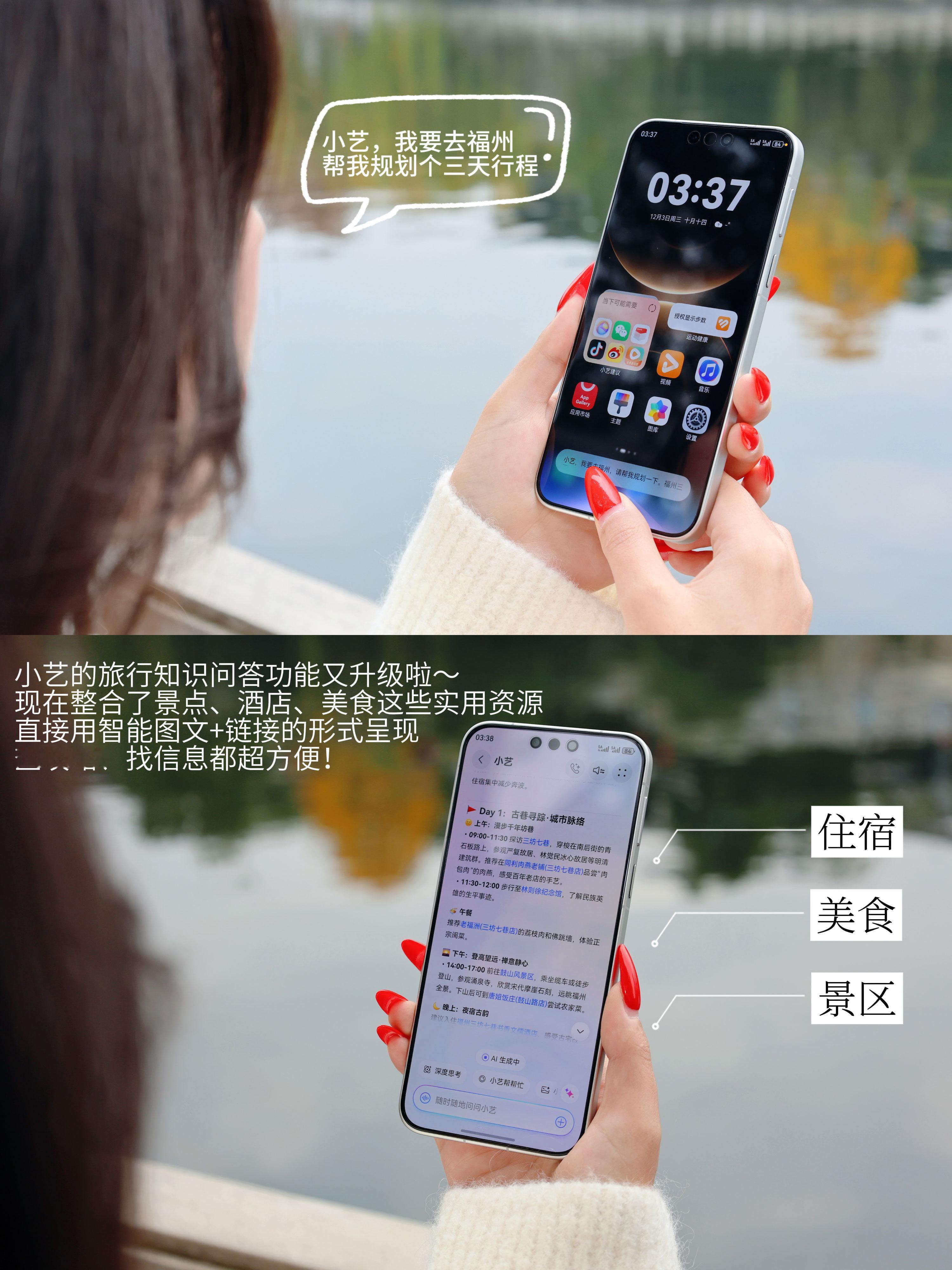 旅行的美好,藏在省心的小细节里总觉得美好的旅行不该被攻略绑架,也不该为琐事分心——不用死记硬背景点历史,不用在订票软件间反复切换,更不用为拍废的照片焦虑,能自在感受风景、记录瞬间,才是最舒服的状态。最近的几次旅行,有了HarmonyOS 6上变得更聪明的小艺,就像有了个默默搭把手的“隐形旅伴”~首先,必须要说是,小艺的旅行知识问答功能又升级了!现在TA整合了景点、酒店、美食这些实用资源,查攻略更加方便了,随口问一句小艺后,直接就以图文加链接的形式呈现信息,终于不用费心做功课啦。拍照遇到路人乱入、画面反光也不怕,不用打开复杂修图软件,直接跟小艺说“帮我消除路人、去反光”,很快就能get满意成片。更贴心的是,用小艺输入法的语音转文字功能,旅途中突然冒出来的灵感、想要记录的心情,对着手机随口说几句,就能精准转成文字存下来,不用忙着打字而耽误欣赏风景;要是计划出国旅游也完全不用担心,小艺翻译助手支持多种语言实时互译,不管是点餐、问路,还是和当地人聊天都顺畅无压力,再也不用对着翻译软件逐字逐句核对。旅行结束后,小艺时光机还会自动整理我拍的照片、去过的景点定位,甚至连当时的天气都记得,一键就能生成游记,想分享的时候直接编辑就能发。懒人们这不有福了嘛!这还没完,我还家里长辈出门也能用小艺,贵州话、闽南话这些方言TA都听得懂,还能用方言回应,沟通起来毫无压力。都说越早用小艺,越早拥抱AI时代,果然不错,不管是国内漫游还是出国远行,那些曾让人头疼的琐事,如今都能被这份智能贴心化解,旅行的轻松感,就藏在这个靠谱的小帮手里~人类对小艺的开发不足百分之一