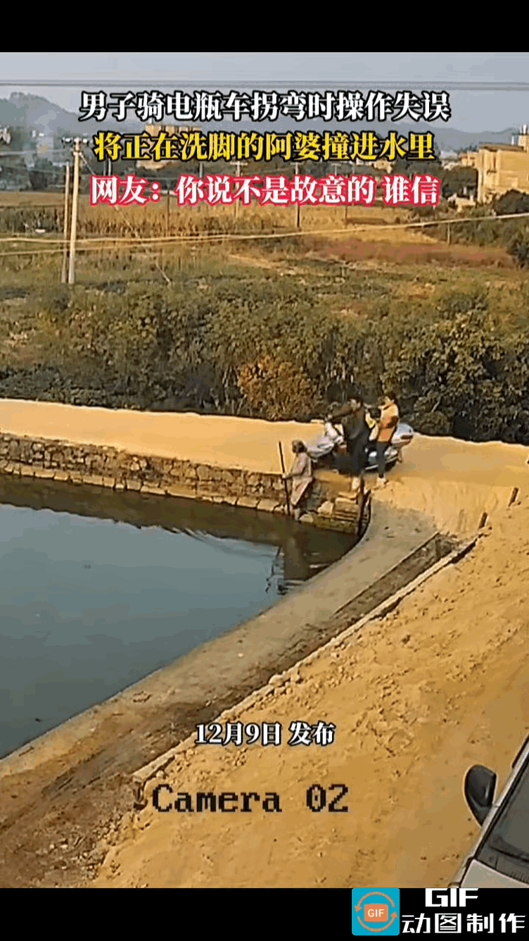 “小伙,你是故意的吧,我怎么感觉,你就是故意冲着我来。” 阿婆站在水边洗拖把,小伙骑着电动车从岸上经过,转弯时操作失误,电动车失控冲入河里,正好将站在河边的阿婆撞进水里。 这种巧合也太罕见了,感觉小伙就像是瞄准了对着阿婆冲过去的,说不是故意的,谁信啊。 其实,肇事元凶应该是那只黑狗,电动车转弯时,狗狗也正好跑到了交叉路口。 电动车为了避让狗狗,转弯半径小了点,结果就冲到了河里,还把阿婆也撞翻了。 三人都掉到了水里,阿婆是最冤的,肇事元凶倒跑得远远的。 这算不算肇事逃逸啊?