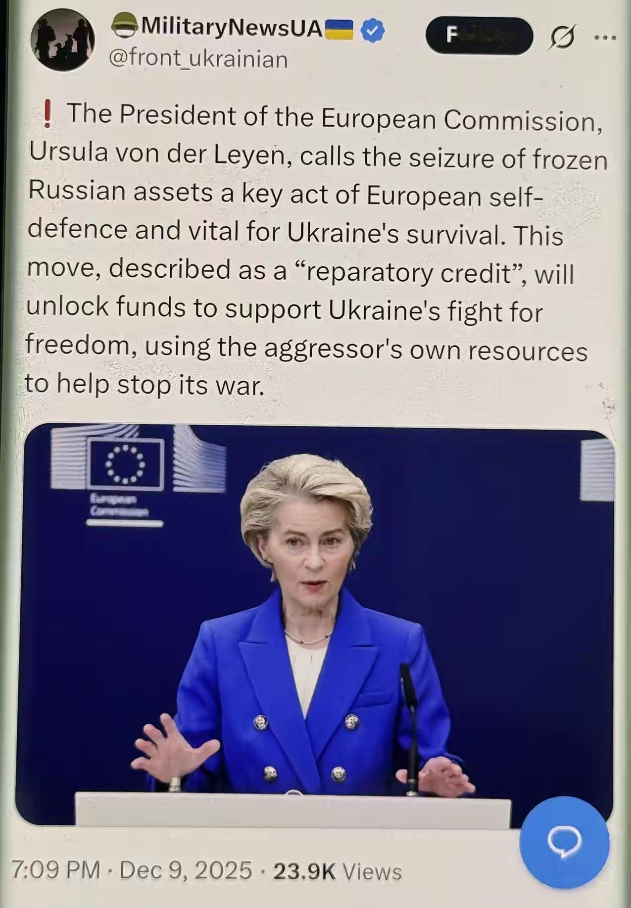 一个新的金融术语诞生:“赔偿信贷”! 欧洲为了搞“以俄资乌”真是绞尽脑汁,整出了“赔偿信贷”这一奇葩金融术语。他们打着不碰本金,只动收益和抵押的幌子,想用被冻结在欧洲的俄罗斯资产给乌贷款。这种强盗行径,把欧洲人贪婪和双标体现得淋漓尽致。