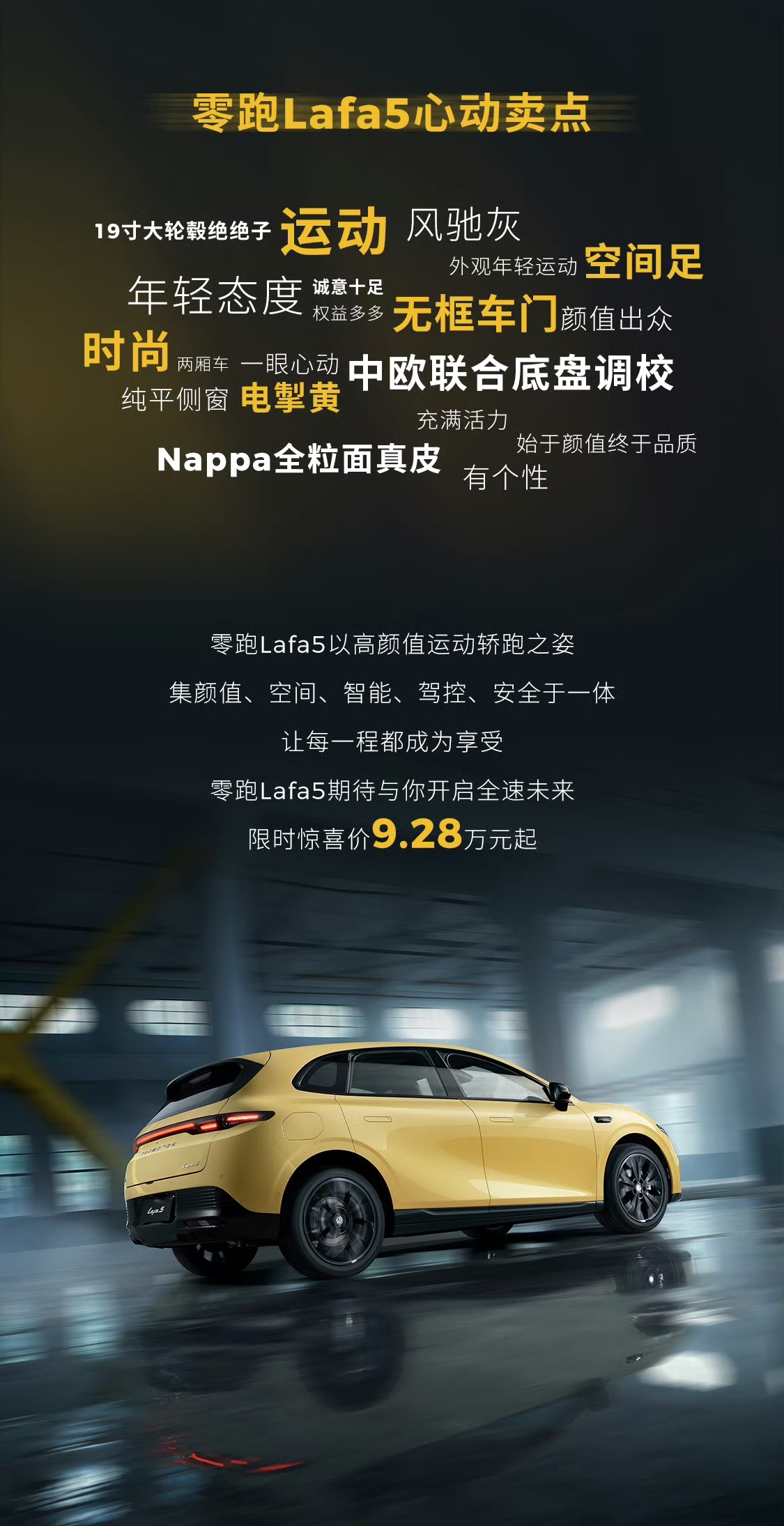 零跑Lafa5今年11月底刚上市,当月销量就超 7K,短短 3 天卖出 7397 辆,在轿车排行上仅次于 M03、小米 SU7 ,水平无需多言吧?小张前段时间也是试驾了Lafa5,比较年轻化的外观内饰,以及相对运动化的调教都是亮点。当时我也提到,这是一款适合年轻人的车。如果你不想只选一台家用车,那么Lafa5是个好选择。实际数据统计也印证了我的观点。比如,零跑Lafa5的用户超一半是 35 岁以下的年轻朋友,女性用户占比更是高达48%。虽然Lafa5同样有着同级别内比较宽敞的乘坐和装载空间,但对于用户而言,颜值为上!像竞速灰内饰有超过6成的用户选择,外饰专属色的选择占比超 77%,也能印证我的观点。作为零跑迈向年轻个性市场的第一步,Lafa5定位高颜值运动轿跑,和之前的主力B、C系列形成差异,后者全能、实惠,前者更个性、更运动,专为不将就/不从众的年轻用户而造。放眼15万内市场,这样的选择不多,确实鲜有对手。小张以为,Lafa5一定程度代表着年轻人的生活方式,不仅仅是一辆车,更是个性表达,情绪输出。过去喜欢高尔夫的朋友,却下不去手的朋友,如今可以看看零跑Lafa5 新能源汽车