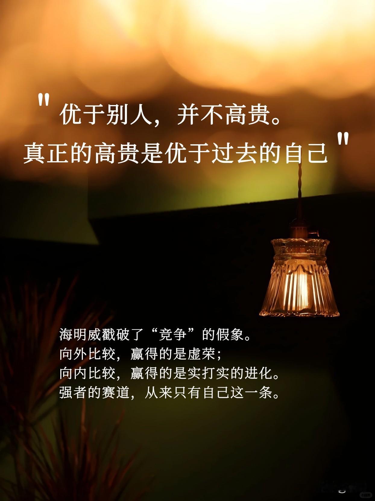 我们活在一场看不见的竞赛里。 总有人比你更快、更高、更亮。 比较,成了内耗最深的源头。 但真正的强者,早已更换了赛场。 他们明白:唯一的对手,永远是昨天的自己。 01.“优于别人,并不高贵。真正的高贵是优于过去的自己。” 海明威戳破了“竞争”的假象。 向外比较,赢得的是虚荣; 向内比较,赢得的是实打实的进化。 强者的赛道,从来只有自己这一条。 02.“知人者智,自知者明。胜人者有力,自胜者强。”——老子《道德经》 了解别人是聪明, 了解自己才是清醒; 战胜别人只算有力, 能战胜自己的懒惰、恐惧与局限,才是真正的强者。 强者的战场,永远在内心。 03.“路漫漫其修远兮,吾将上下而求索。”—— 屈原《离骚》 强者的永恒姿态:前路漫长, 但我的目光只专注于自身的“求索” 我,只与自己较量。 当你不再关心别人的进度条,只专注于填充自己的能量槽时—— 你会惊讶地发现:内心的风暴停了,前行的路,反而清晰了。 收藏这份清醒,从今天起,你唯一的对手,只有自己。