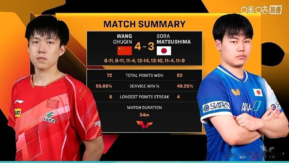 正在直播! WTT总决赛男单1/8决赛 王楚钦4-3落后松岛辉空 第一局,王楚钦6-11松岛辉空 第二局,松岛辉空11-9再下一城 第三局,王楚钦11-3扳回一局 第四局,松岛辉空14-12再赢一局 第五局,王楚钦12-10再扳一局 第六局,王楚钦11-9赢下胜局 最终,王楚钦4-3大逆转对手,成功晋级八强![大笑]