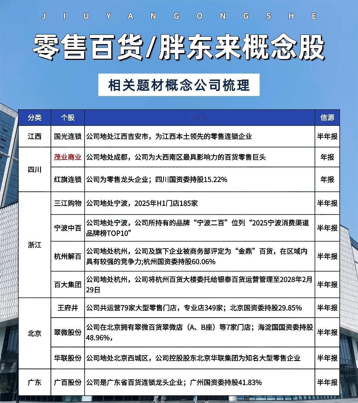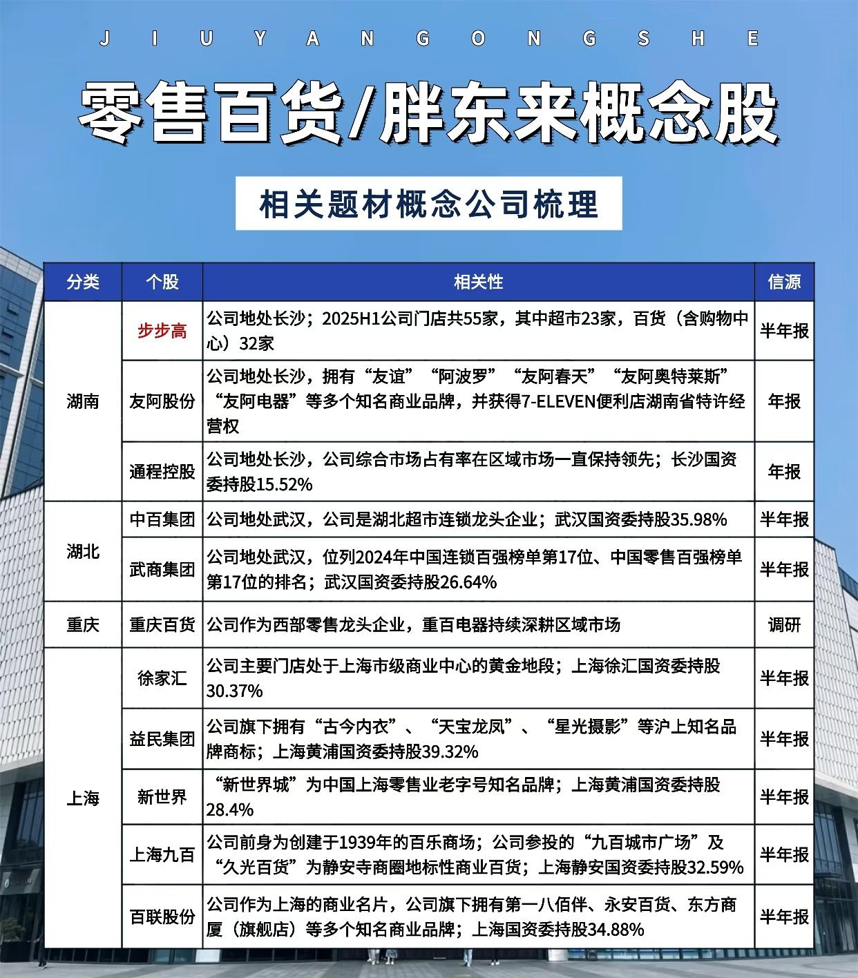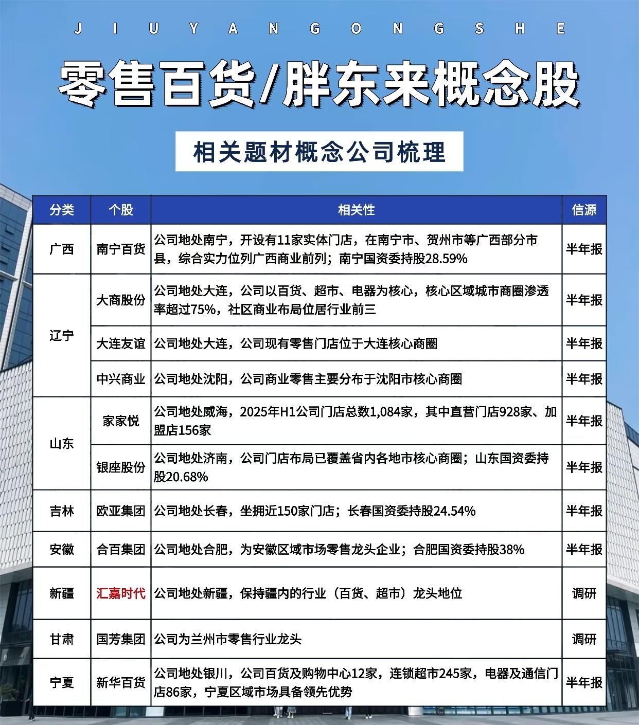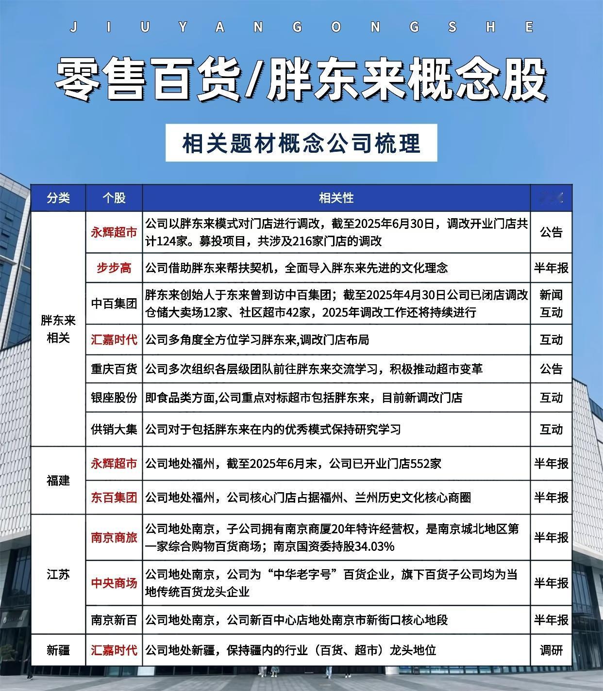 “零售百货/胖东来概念股”,梳理了全国多地与胖东来模式相关的零售百货类上市公司信息,按地域分类呈现,内容包括公司所在地、业务特点、与胖东来的关联、门店规模及国资背景等,并注明信息来源(如公告、半年报、年报、调研、互动等)。 胖东来相关公司:永辉超市以胖东来模式调改门店,截至2025年6月30日已开业调改门店124家,募投项目涉及216家门店;步步高获胖东来创始人于东来到访;中百集团学习胖东来并闭店调改仓储大卖场及社区超市;汇嘉时代、重庆百货、银座股份、供销大集等均从布局、品类或管理模式上对标或学习胖东来。 分省梳理: - 福建:永辉超市(福州,2025年6月末开业门店552家)、东百集团(福州核心商圈)、南京商旅、南京新百(南京新街口核心地段)、中央商场(南京“中华老字号”百货龙头)。 - 湖南:步步高(长沙,2025年上半年门店55家,含超市23家、百货32家)、友阿股份(长沙,拥有多个知名商业品牌及7-ELEVEN湖南特许经营权)、通程控股(长沙,区域市场占有率领先,长沙国资委持股)。 - 湖北:中百集团(武汉,湖北超市连锁龙头,武汉国资委持股)、武商集团(武汉,2024年连锁百强第17位,武汉国资委持股)。 - 重庆:重庆百货(西部零售龙头,重百电器深耕区域)。 - 上海:徐家汇(市级商业中心黄金地段,徐汇国资委持股)、益民集团(沪上知名品牌,黄浦国资委持股)、新世界(“新世界城”老字号,黄浦国资委持股)、上海九百(静安寺商圈地标,静安国资委持股)、百联股份(上海商业名片,旗下多知名品牌,上海国资委持股)。 - 江西:国光连锁(吉安,江西本土领先零售连锁)。 - 四川:茂业商业(成都,大西南影响力百货零售巨头)、红旗连锁(零售龙头,四川国资委持股)。 - 浙江:三江购物(宁波,2025年上半年门店185家)、宁波中百(“宁波二百”入2025宁波消费渠道品牌榜TOP10)、杭州解百(“金鼎”百货,杭州国资委持股)、百大集团(杭州百货大楼委托银泰运营至2028年)。 - 北京:王府井(运营79家大型零售门店、349家专业店,北京国资委持股)、翠微股份(北京7家门店,海淀国资委持股)、华联股份(北京西城区,控股股东为知名零售企业)。 - 广东:广百股份(广东百货连锁龙头,广州国资委持股)。 - 广西:南宁百货(南宁11家实体门店,广西商业前列,南宁国资委持股)。 - 辽宁:大连友谊(大连核心商圈零售门店)、中兴商业(沈阳核心商圈)。 - 山东:家家悦(威海,2025年上半年门店1084家,含直营928家、加盟156家)、银座股份(济南覆盖省内核心商圈,山东国资委持股)。 - 吉林:欧亚集团(长春近150家门店,长春国资委持股)。 - 安徽:合百集团(合肥区域零售龙头,合肥国资委持股)。 - 新疆:汇嘉时代(疆内百货、超市龙头)。 - 甘肃:国芳集团(兰州零售行业龙头)。 - 宁夏:新华百货(银川,百货及购物中心12家、连锁超市245家、电器及通信门店)。 整体来看,这些公司多具备区域龙头地位,部分与胖东来模式深度关联,且不少有地方国资背景,信息来源以定期报告和市场调研为主。