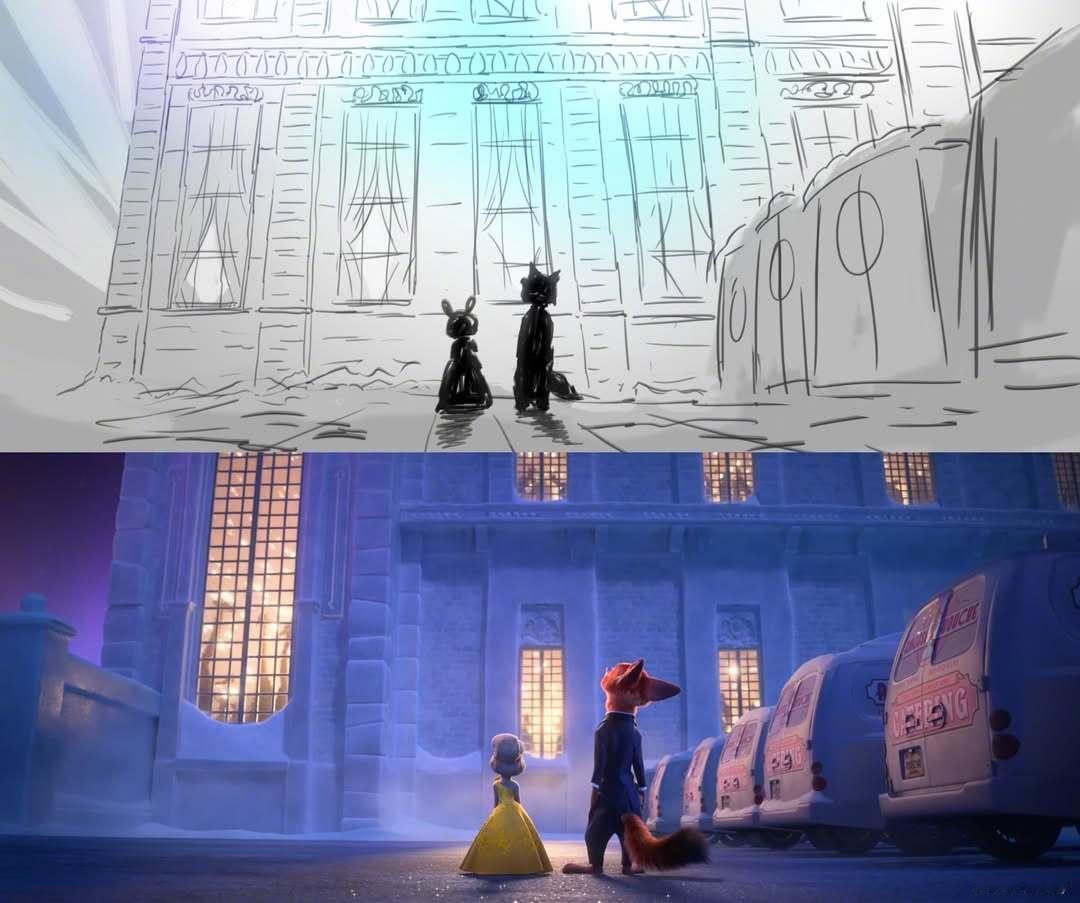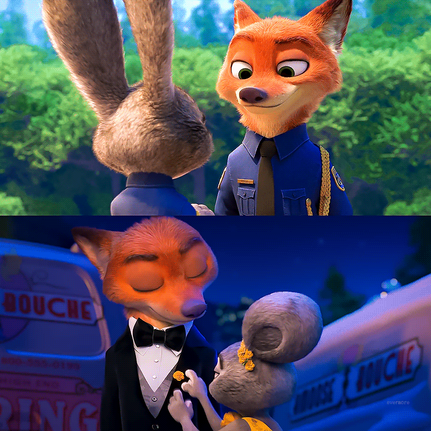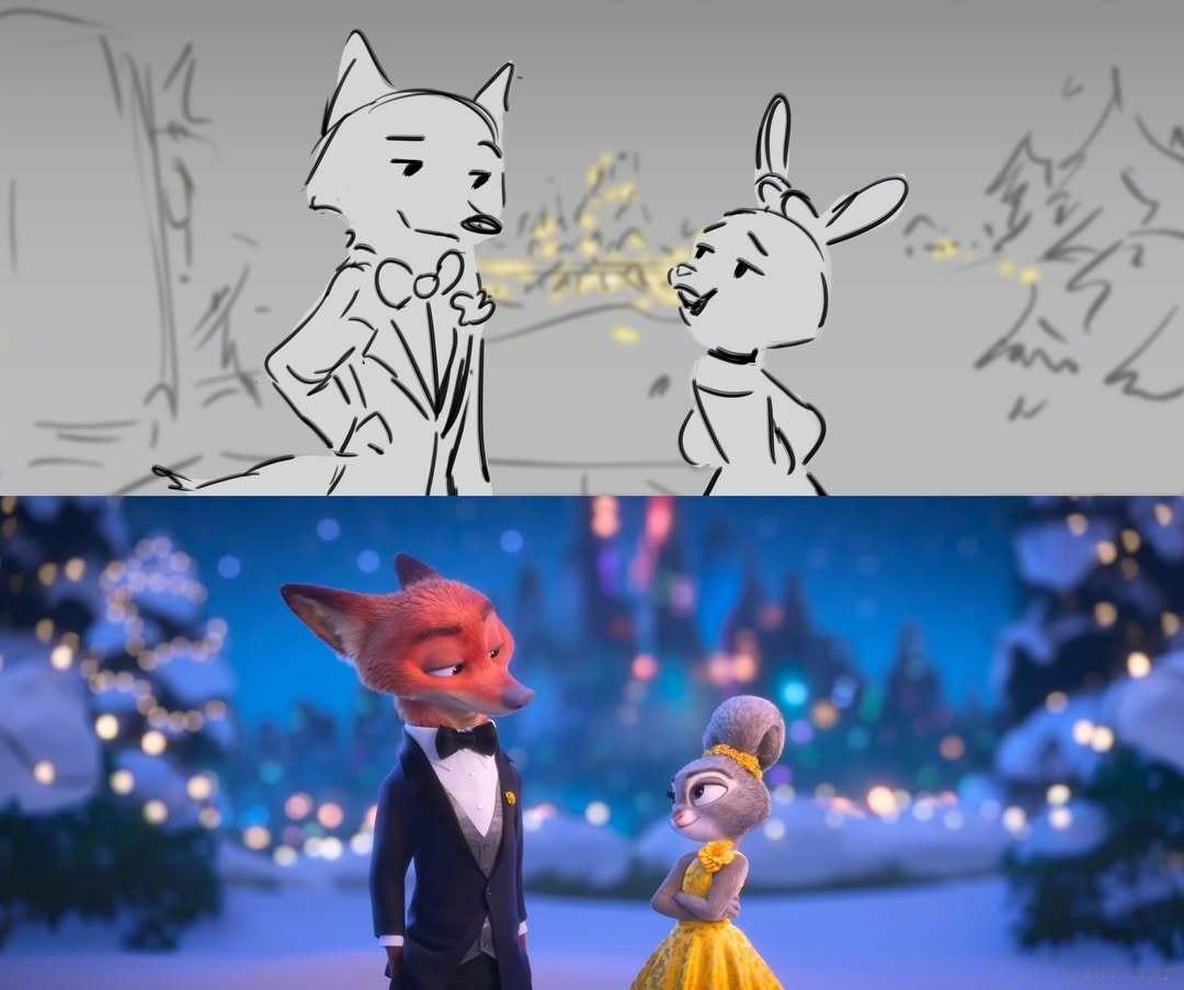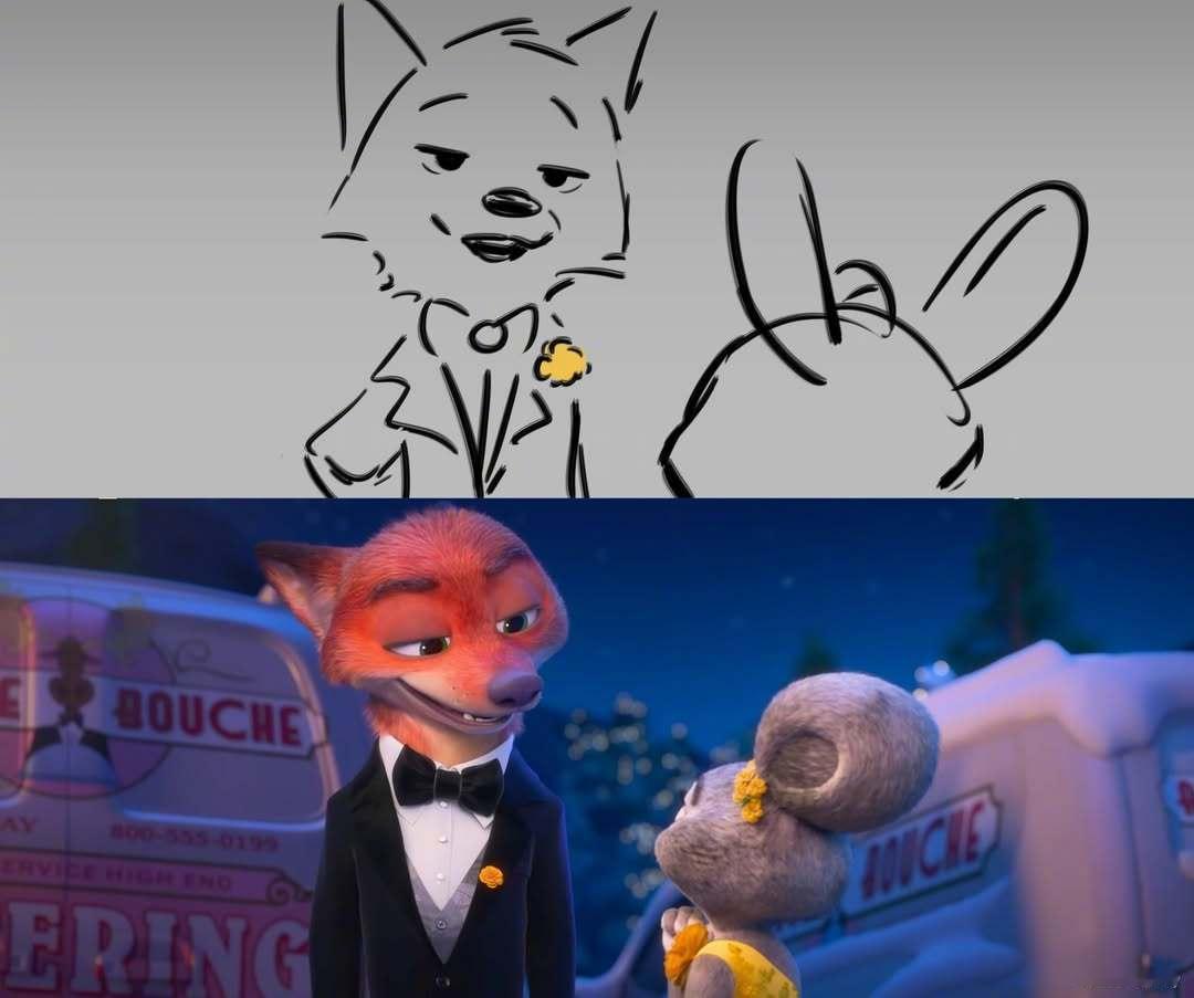 和朱迪尼克一起重返动物城《动物城2》故事板设计师Sandeepan Chanda,最新分享宴会场景的分镜脚本,他在ins补充了剧情构想幕后:“我们想强调尼克与朱迪的搭档关系依然牢固,他们依然彼此关心。导演建议添加一些有爱的小互动,比如朱迪给尼克整理领结什么的。我看过朱迪的晚礼裙设计稿上有花朵装饰,所以设计了她把花别在尼克的西装上。很开心这个小细节最终呈现在了电影里。”疯狂动物城2概念图中的尼克和朱迪 跨年电影愿