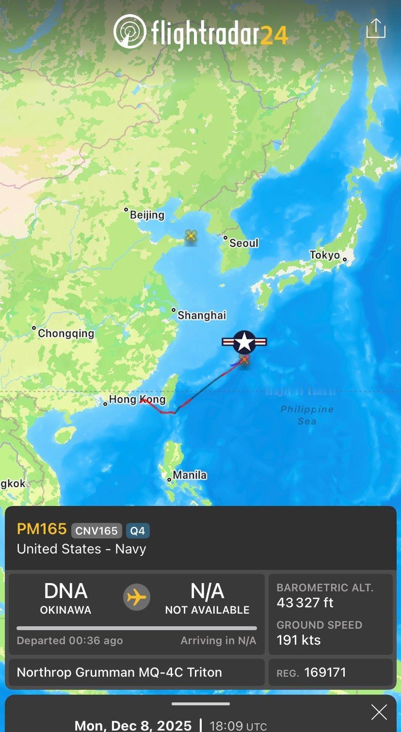 根据2025年12月9日,世界航空航线数据,日本海上自卫队两架P-1反潜巡逻机,正在东京湾附近海域转圈飞行,对对海进行搜索,目标不详。同时,美国海军MQ-4C“海神”战略无人机也紧急升空,在东海活动实施侦察。不排除,日本海上自卫队两架P-1反潜巡逻机,美国海军MQ-4C“海神”战略无人机,是在绕着中国海军辽宁号航母战斗群,或者增援辽宁号航母战斗群的中国海军舰艇飞行,实施跟踪和监视,也不排除中国海军辽宁号航母战斗群有核潜艇支援,所以日本海上自卫队需要P-1反潜巡逻机,在东京湾搜索。 这个初冬的清晨,东京湾的海雾还未散尽,P-1巡逻机的螺旋桨就在云层下划出密集航迹,反潜声呐浮标像银色的针,一枚接一枚刺入灰蓝色的海面。 一天前的12月8日,日本吴港军港的泊位突然空出一个位置——出云级二号舰“加贺”号轻型航母拔锚起航,舰艏劈开浪花的方向,直指西北海域。 这艘满载排水量3万吨的“准航母”,甲板上停靠着6架美国海军陆战队提供的F-35B隐身战机,这是日本战后首次在航母上部署固定翼舰载机。 美日侦察机的异常举动,恰好与“加贺”号的动向形成诡异的呼应。 MQ-4C“海神”无人机在东海的滞空时间超过24小时,合成孔径雷达反复扫描同一海域,这种持续监视模式通常只用于追踪高价值移动目标。 有人猜测这只是美日的年度联合演练,但翻开日历就会发现,原计划的“利剑”演习要等到下月才启动。 更值得玩味的是反潜搜索——P-1巡逻机的磁异探测器在东京湾海底划出弧线,这种针对核潜艇的战术动作,暗示着中国航母战斗群可能还有水下力量伴随。 按照48小时1000公里的常规航速推算,辽宁舰若从一周前的西太平洋位置出发,此刻完全可能抵近本州岛东部海域。 日本自卫队已连续两天未通报辽宁舰位置,这种信息沉默本身,或许就是最明确的信号。 当“加贺”号带着6架F-35B全速北上时,西太平洋上可能正在形成罕见的三方航母对峙——中国辽宁舰、美国“华盛顿”号、日本“加贺”号,三艘巨舰的雷达波束在海天之间无声交织。 F-35B的隐身优势确实棘手,但歼-15T的飞行员们正盯着座舱里的多源数据链——来自空警-500的预警信息、无侦-7传回的实时甲板图像、光学卫星标注的“加贺”号坐标,正源源不断汇入战术终端。 红外搜索系统在-40℃的高空锁定热源的效率,有时比雷达更可靠,尤其是对那些打开加力燃烧室的短距起降战机。 日本试图用3万吨的轻型航母对抗辽宁舰,但F-35B的数量仅够勉强组成两个小编队,且维护依赖美军技术支持。 而中国海军的体系化作战链路,已将航母、预警机、卫星、无人机编织成一张立体感知网。 这场发生在东京湾外的无声较量,本质是远洋投射能力的实力对话。 当P-1巡逻机的声呐员紧盯着示波器上的声波图谱时,他们或许已经意识到:中国海军的航迹,早已越过了第一岛链的心理边界。