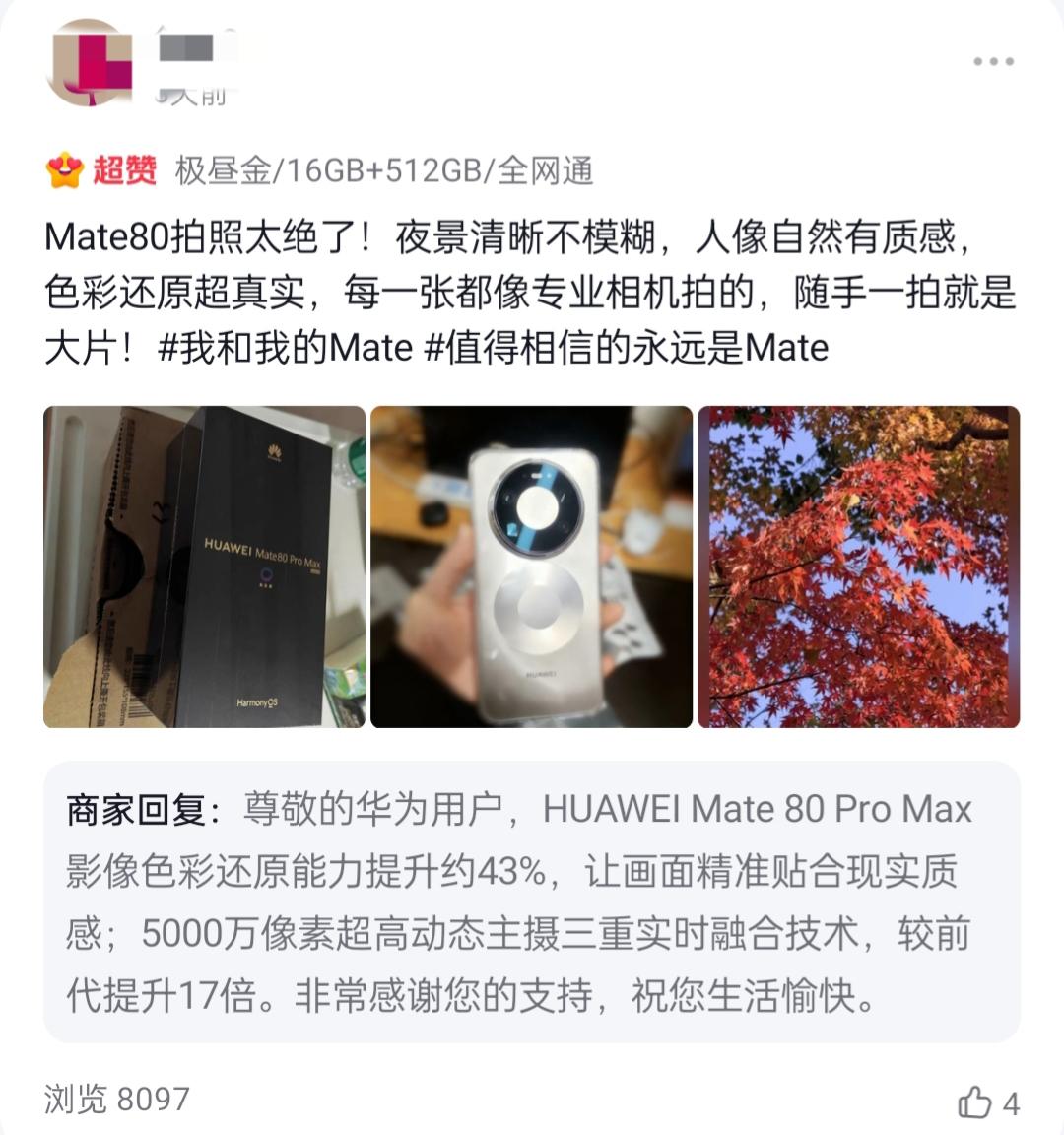 万万没想到,网友们对华为Mate80 Pro Max评价这么高! 鸿蒙6系统在国内一枝独秀,搭载该系统的华为Mate80 Pro Max性能如何? 打开官方旗舰店的留言区,第一批使用华为Mate80 Pro Max的用户已经在官方的平台谈使用感受了。 网友一:华为Mate Pro Max今年的配置太顶了,屏幕超级清晰,质感很好。他表示,很喜欢华为的这款手机的摄影功能,并表示打游戏不卡顿很流畅,续航贼强。 网友二:拍照功能真是一绝!夜景清晰不模糊,人像自然有质感。 网友三:性能没得说,运行速度很好,散热也好,玩游戏流畅。 搭载鸿蒙6系统的这款手机在性能上较上一代提高了很多。此外, 在手机上还有懂你情绪的AI主题,这是华为的情绪计算模型,你的喜怒哀乐,它都能感知到。鸿蒙6系统,国产系统的巅峰之作, 还是要点赞一下!