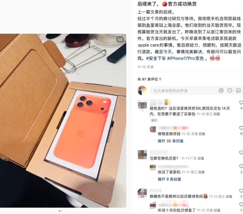 例子三,17 Pro Max首发橙色的部分批次会褪色,结果就是完全不扯皮,苹果直接给用户免费换新了,是全新机不是官换机,很难得了。